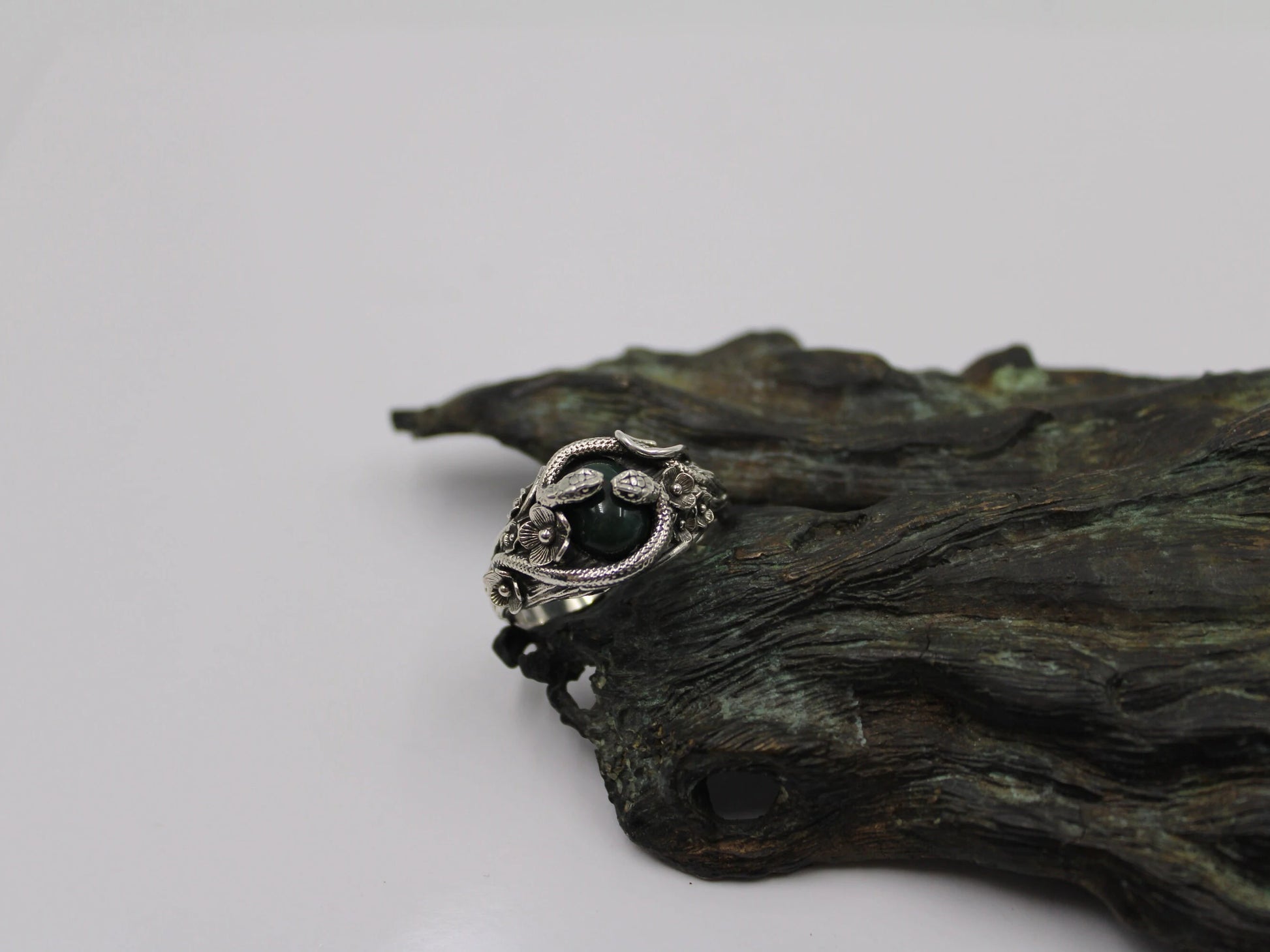 Each piece of jewelry is created using a digital sculpting program to sculpt the snakes, flowers, and branch texture of the mounting, then the piece of jewelry is brought to life through the age old method of lost wax casting. After casting each ring is hand finished, including texturing, polishing, stone setting and oxidizing the silver.