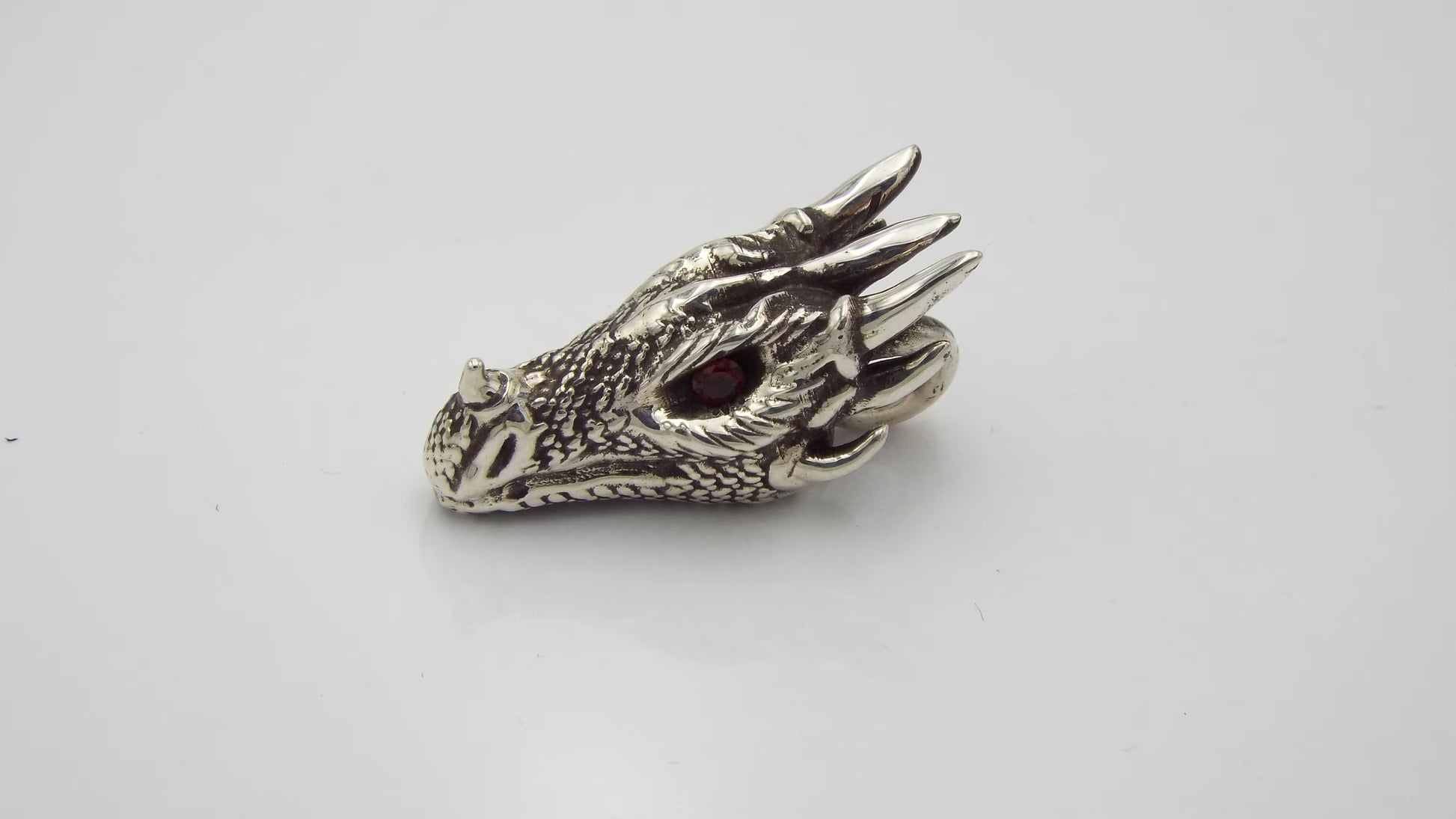 This design is a solid sterling silver dragon head, complete with 3mm round Garnet eyes. The piece of jewelry begins its life as a concept, that I then bring to life using a digital sculpting program. In this part of the process I give the piece its form, shaping everything from the shape of the head down to the scales. The I use the lost wax casting method to recreate the design in silver. After that step I add the ring for the chain to side through, add additional texture, set the gemstones, polish the piece and apply an oxidizing agent to highlight the details.