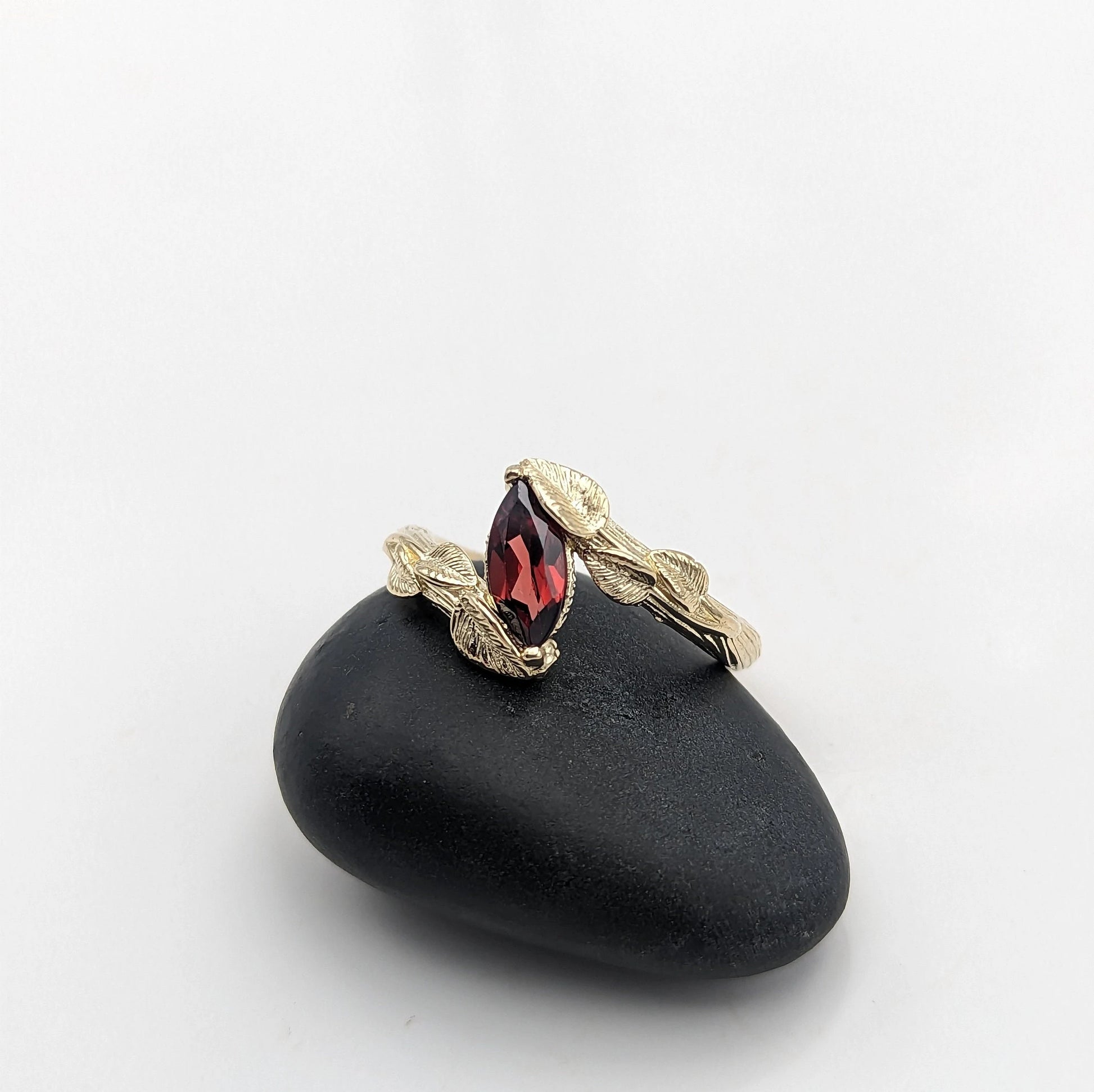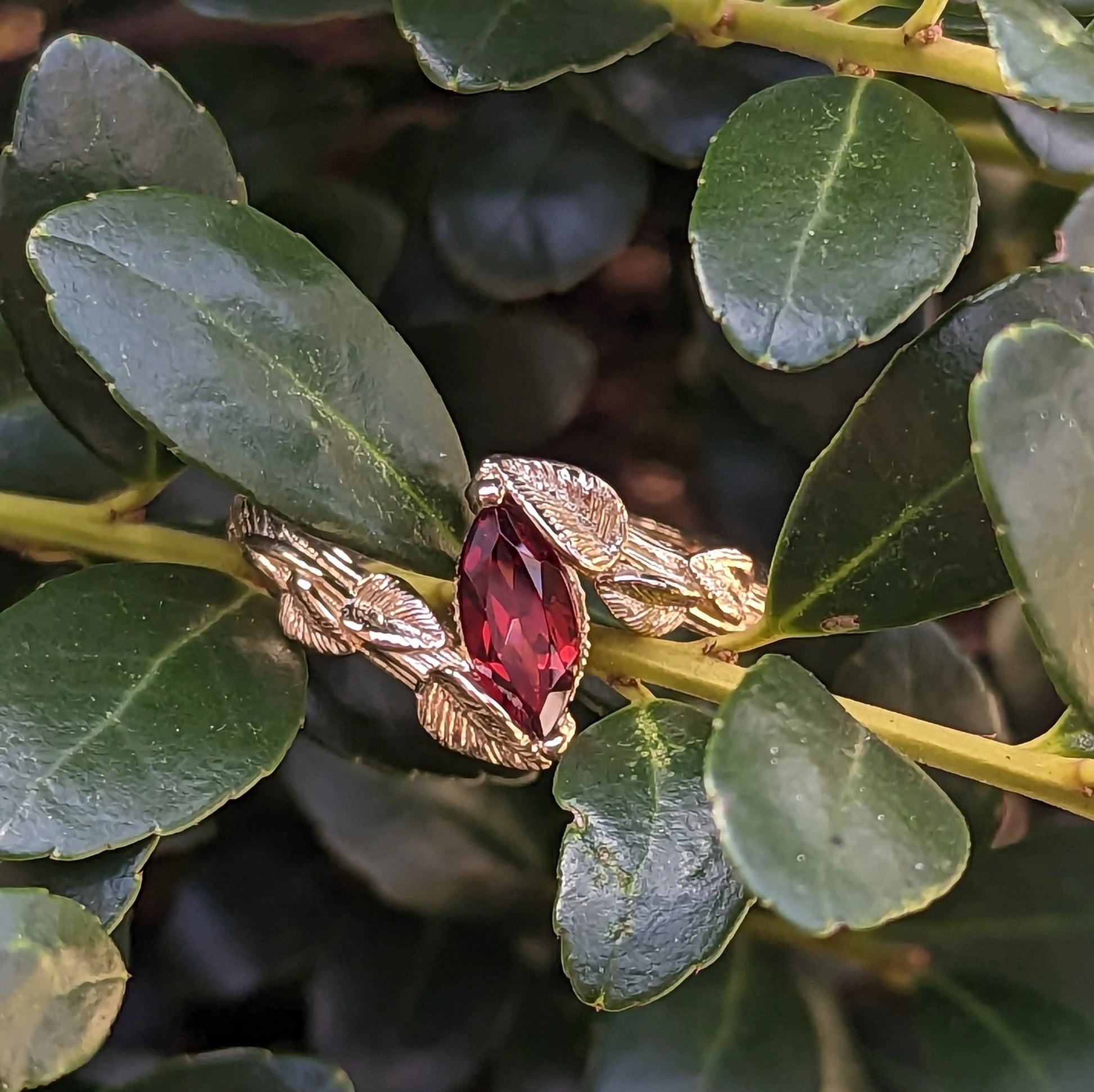 Garnet of the Forest. Made in sold 14k Gold, was ring was inspired by the way morning sun turns red and shines down through the leaves of trees. This ring would make the perfect statement ring, or unique engagement ring!