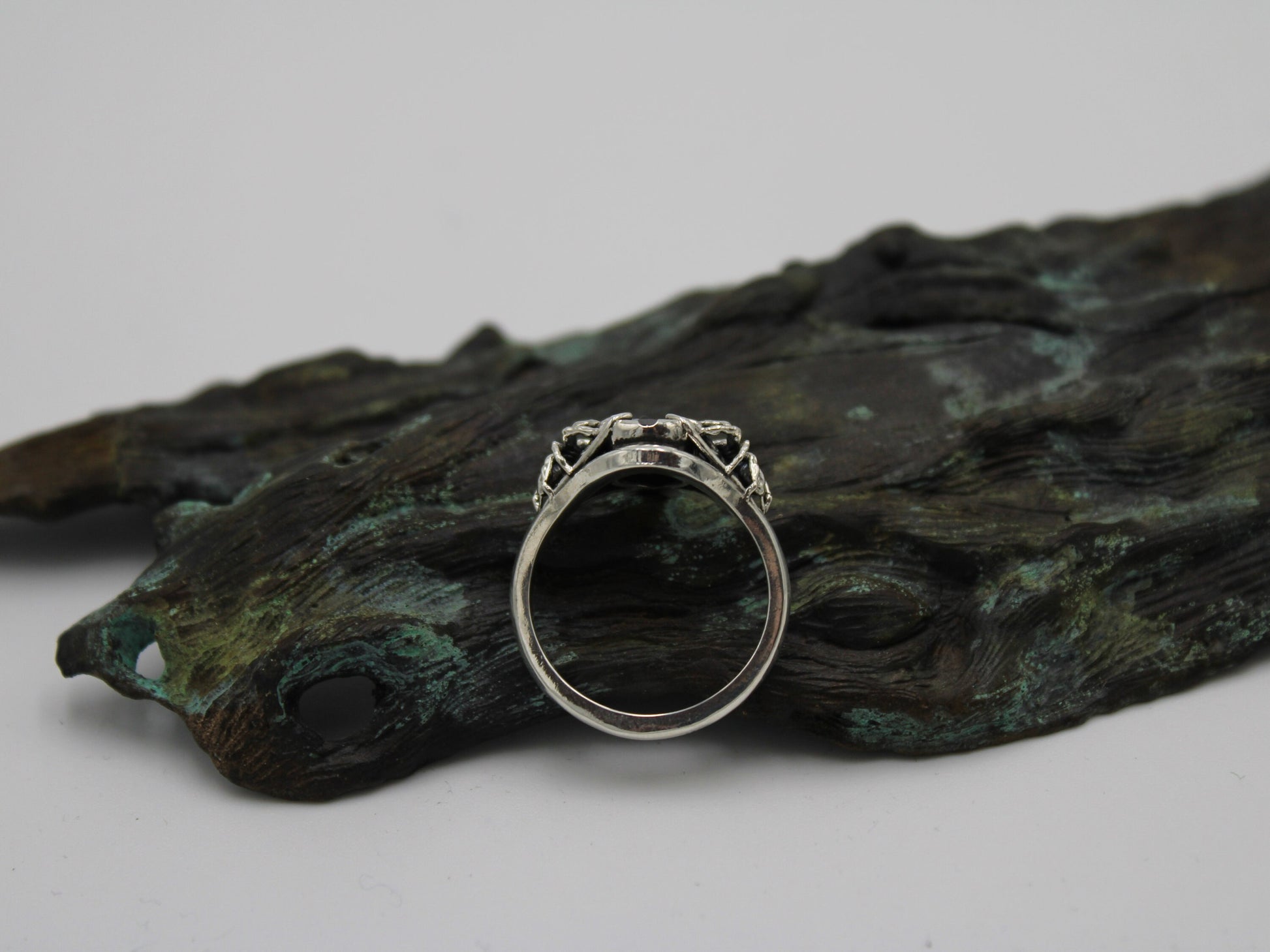 Each piece of jewelry is created using a digital sculpting program to sculpt the spiders and texture of the mounting, then the piece of jewelry is brought to life through the age old method of lost wax casting. After casting each ring is hand finished, including texturing, polishing, stone setting and oxidizing the silver.