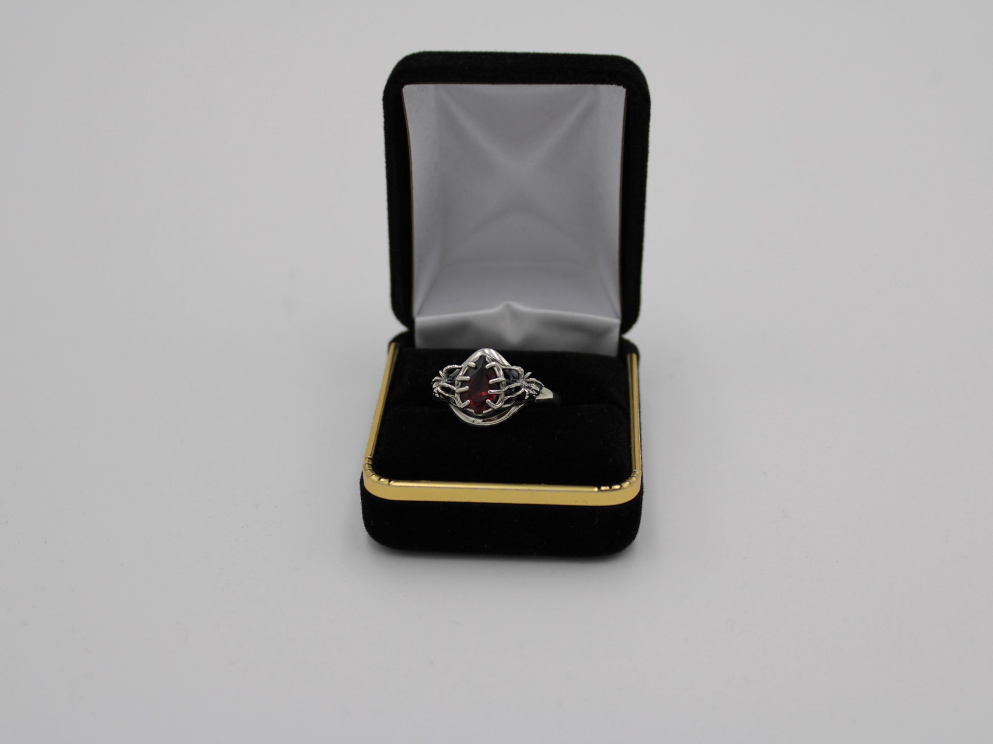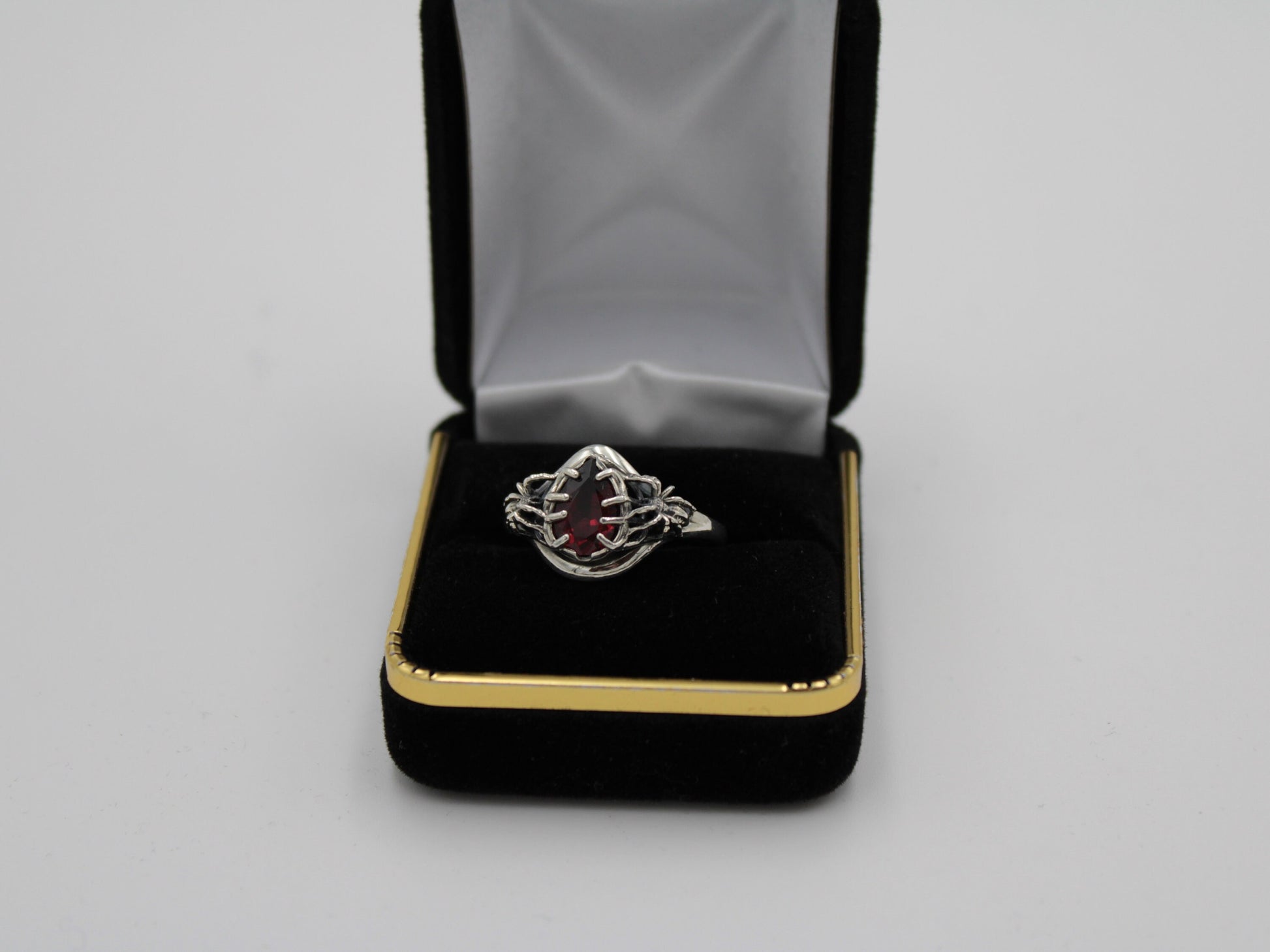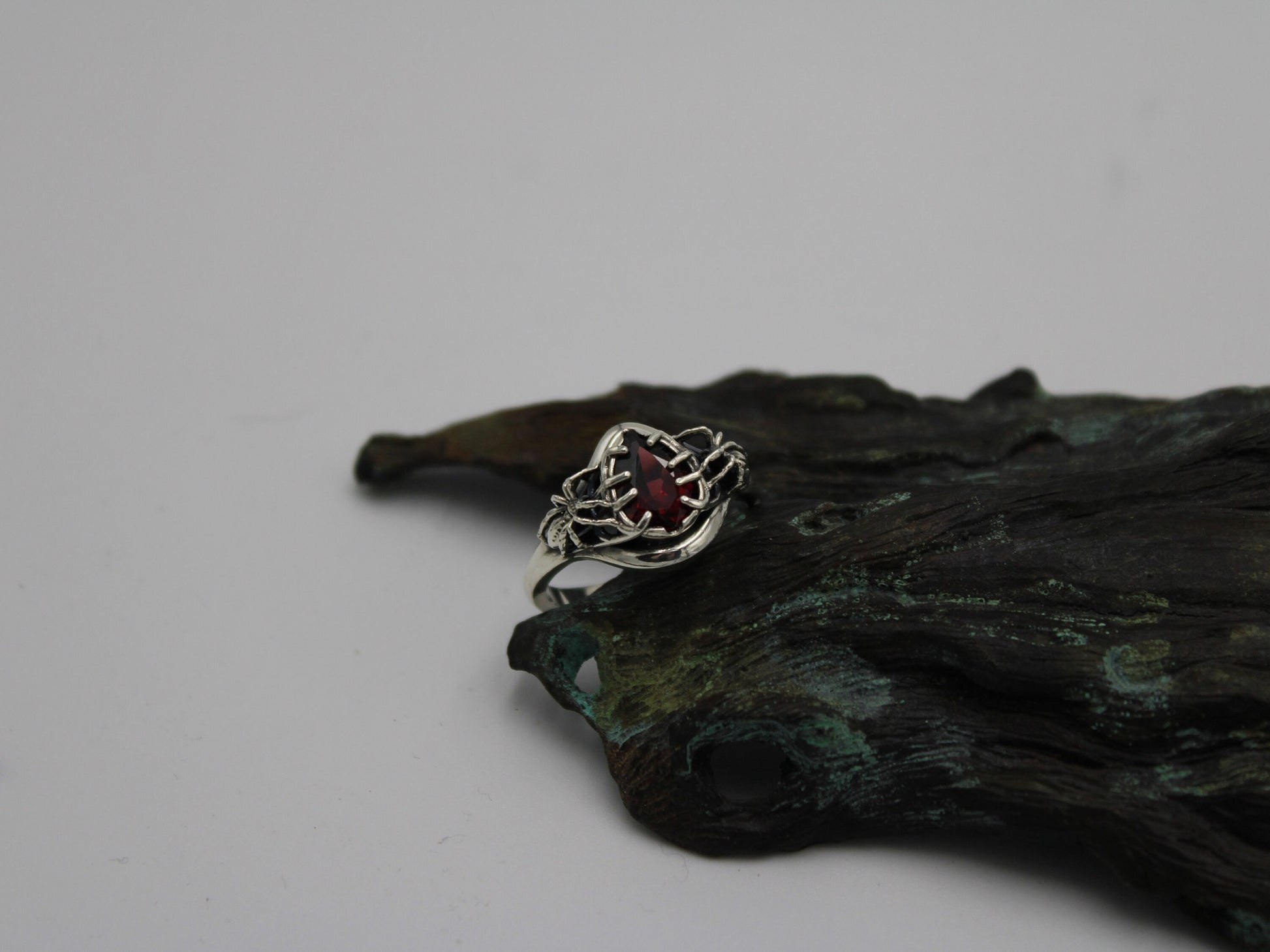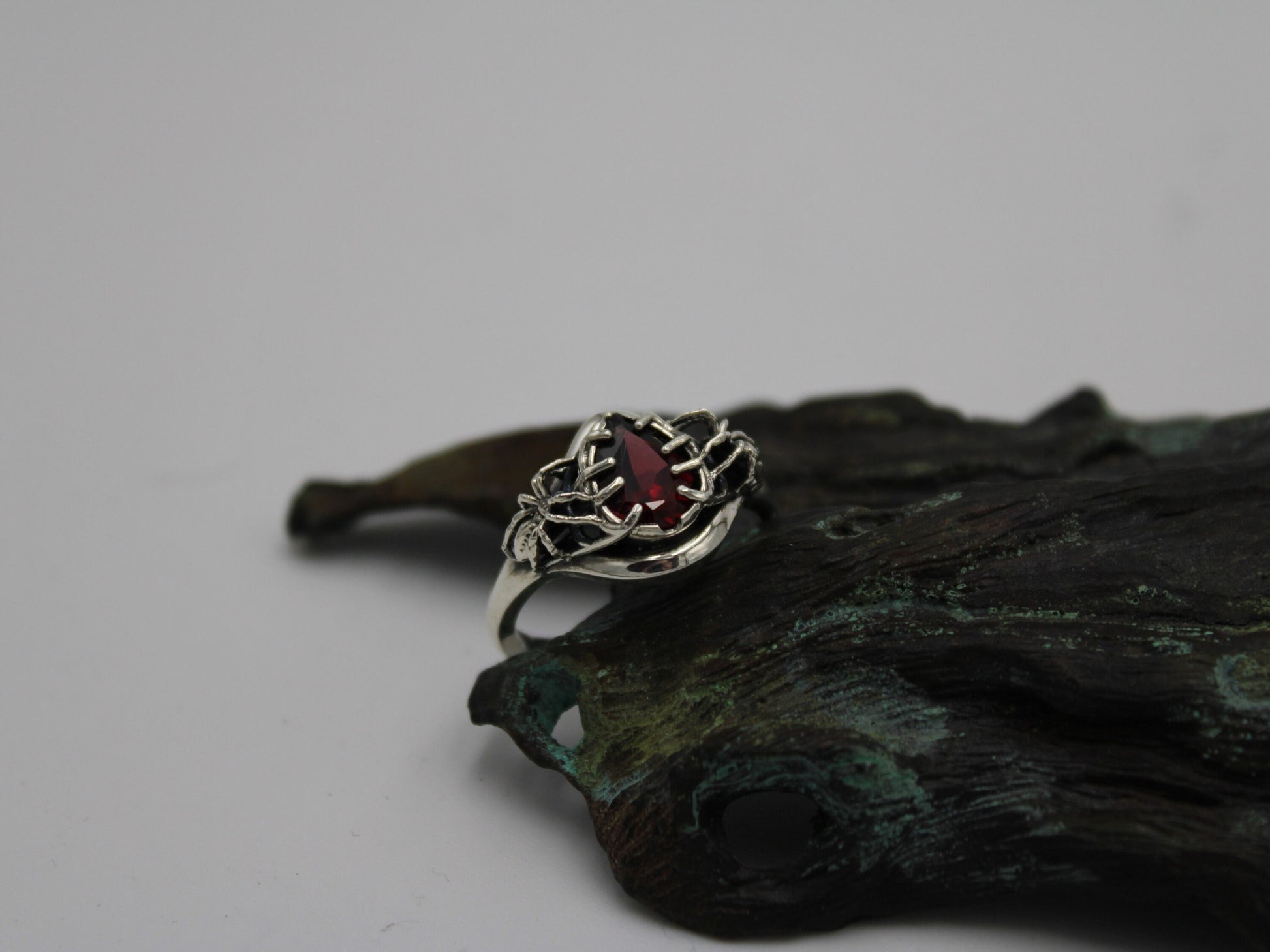 "Teardrop Garnet Spider" Sterling Silver Ring. This ring was inspired by the way spiders crawl along any surface, sometimes freezing as if a statue. The spiders crawl around the ring to surround a beautiful 10x7mm pear cut Garnet. The ring features a Teardrop Garnet in a Solid Sterling Silver mounting and will make the perfect artistic accent to show off your personal style.