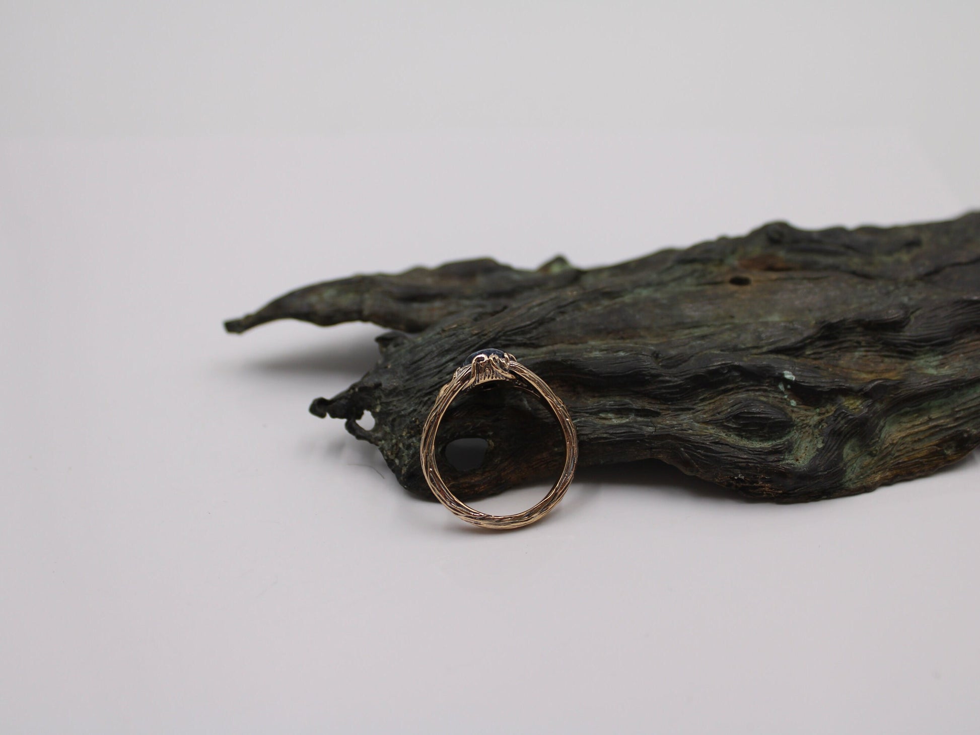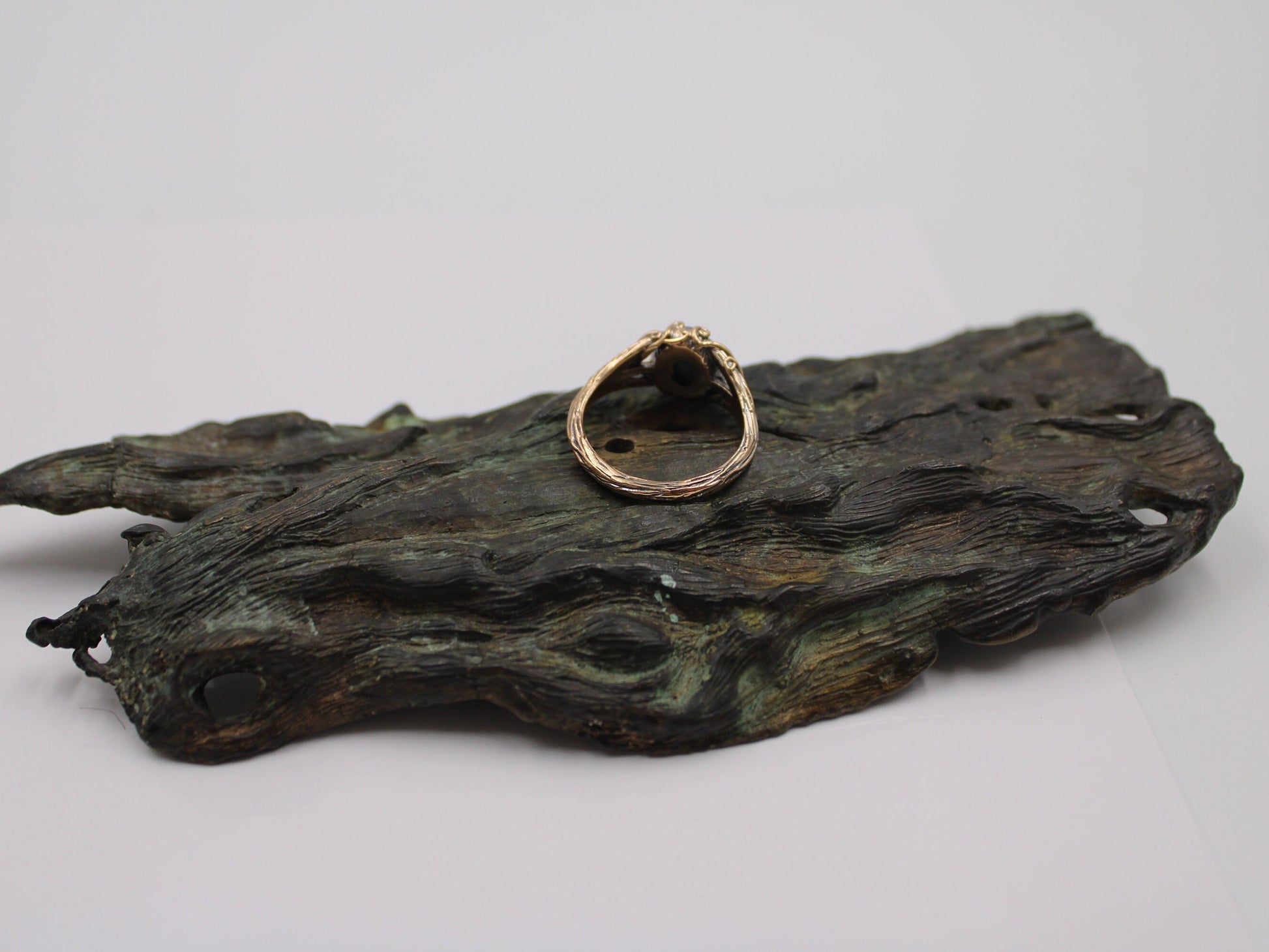 Each piece of jewelry is created using a digital sculpting program to sculpt the vines and branch texture of the mounting, then the piece of jewelry is brought to life through the age old method of lost wax casting. After casting each ring is hand finished, including texturing, polishing, and stone setting.