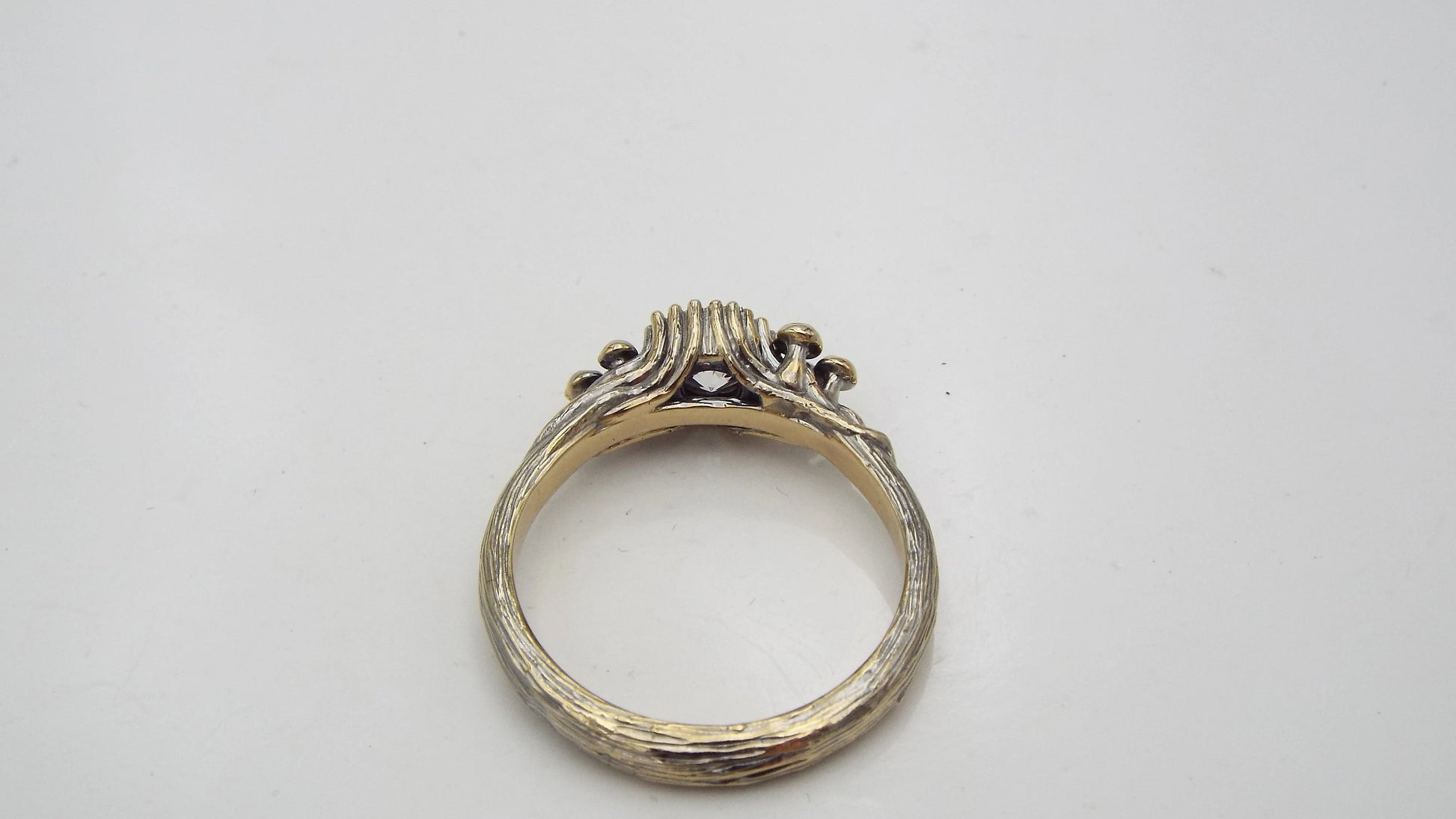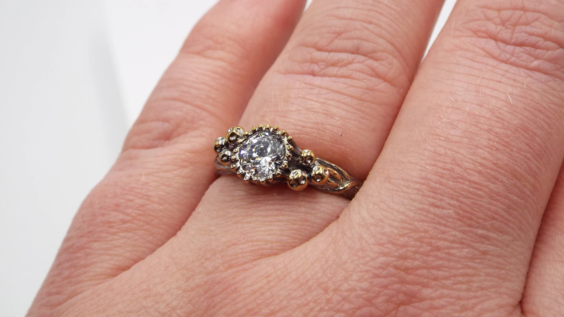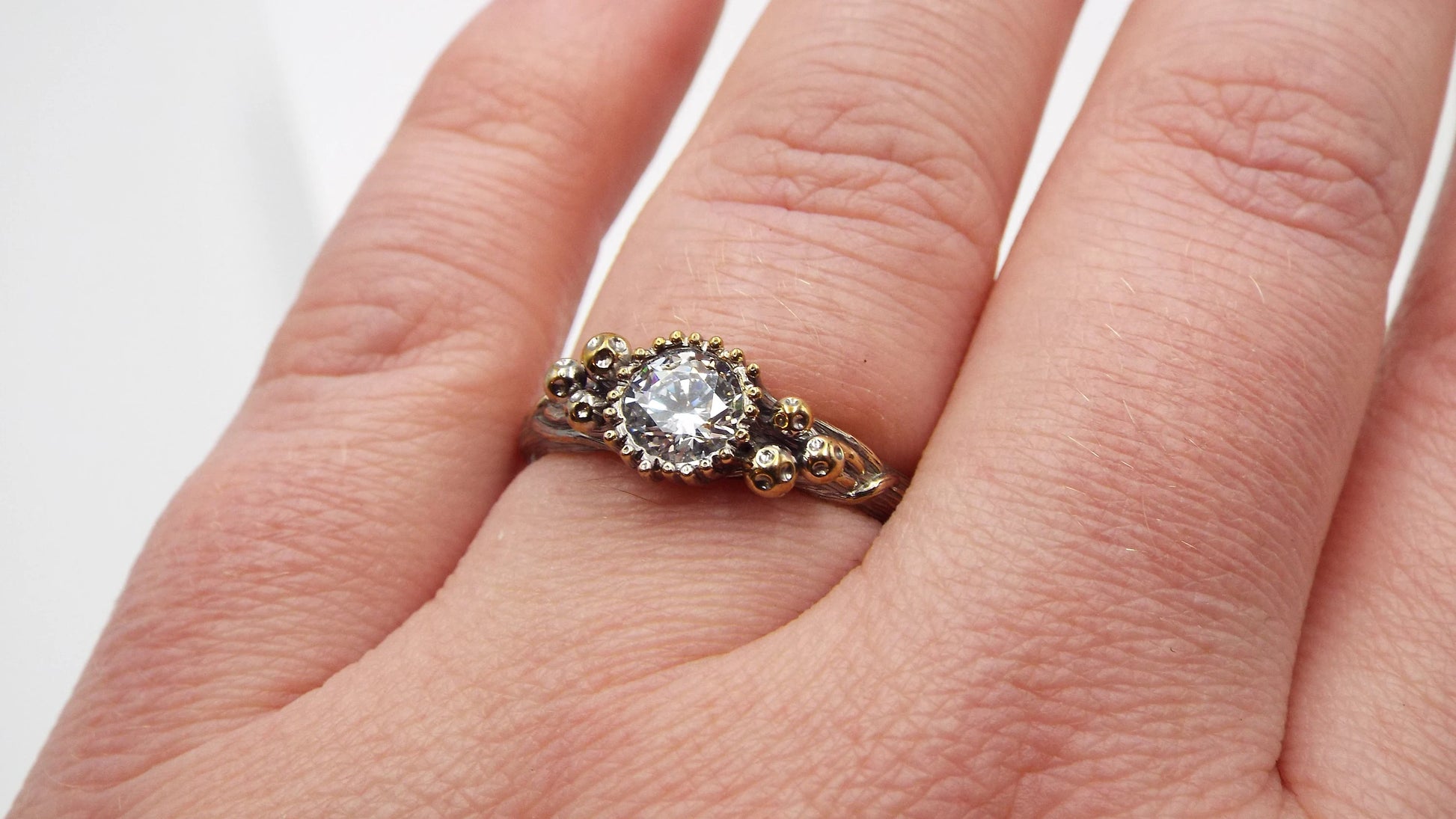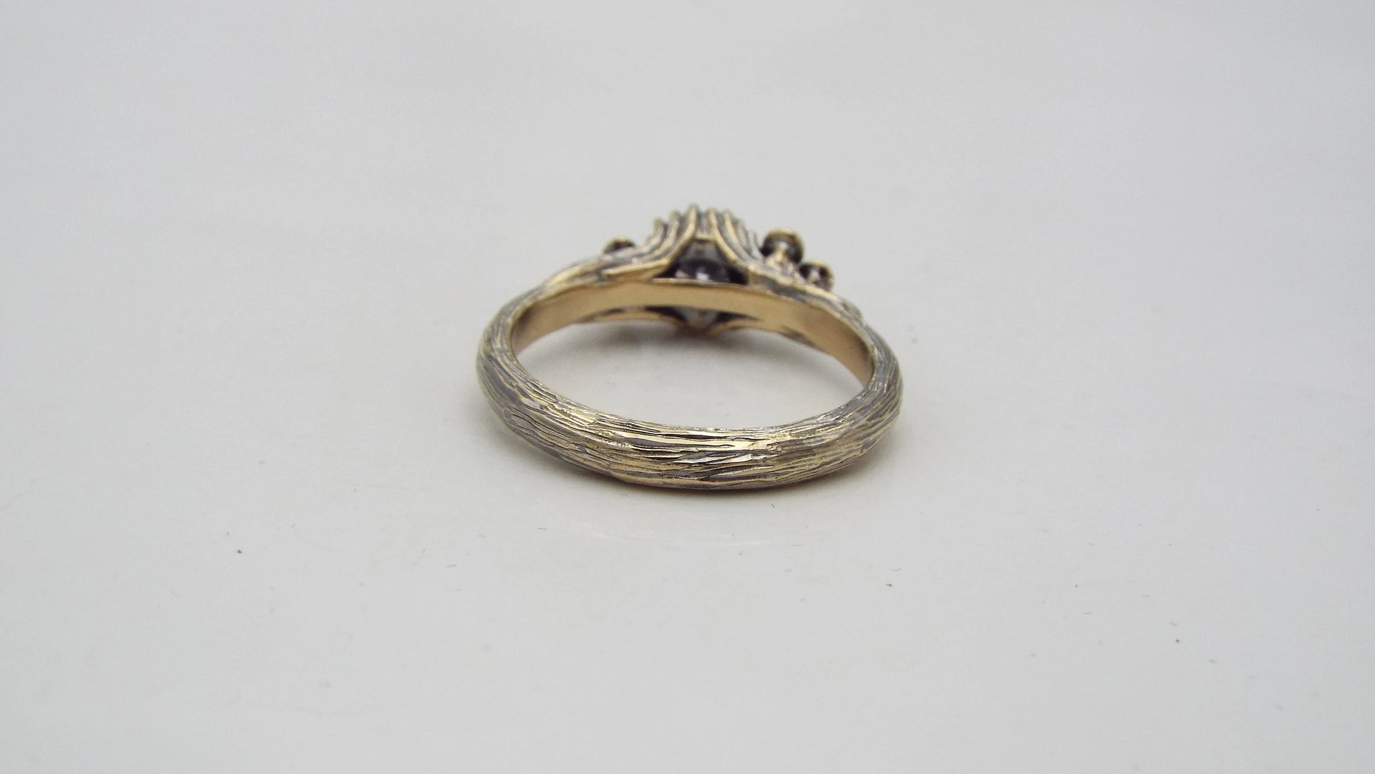 Each piece of jewelry is created using a digital sculpting program to sculpt the vines and branch texture of the mounting, then the piece of jewelry is brought to life through the age old method of lost wax casting. After casting each ring is hand finished, including texturing, polishing, and stone setting.