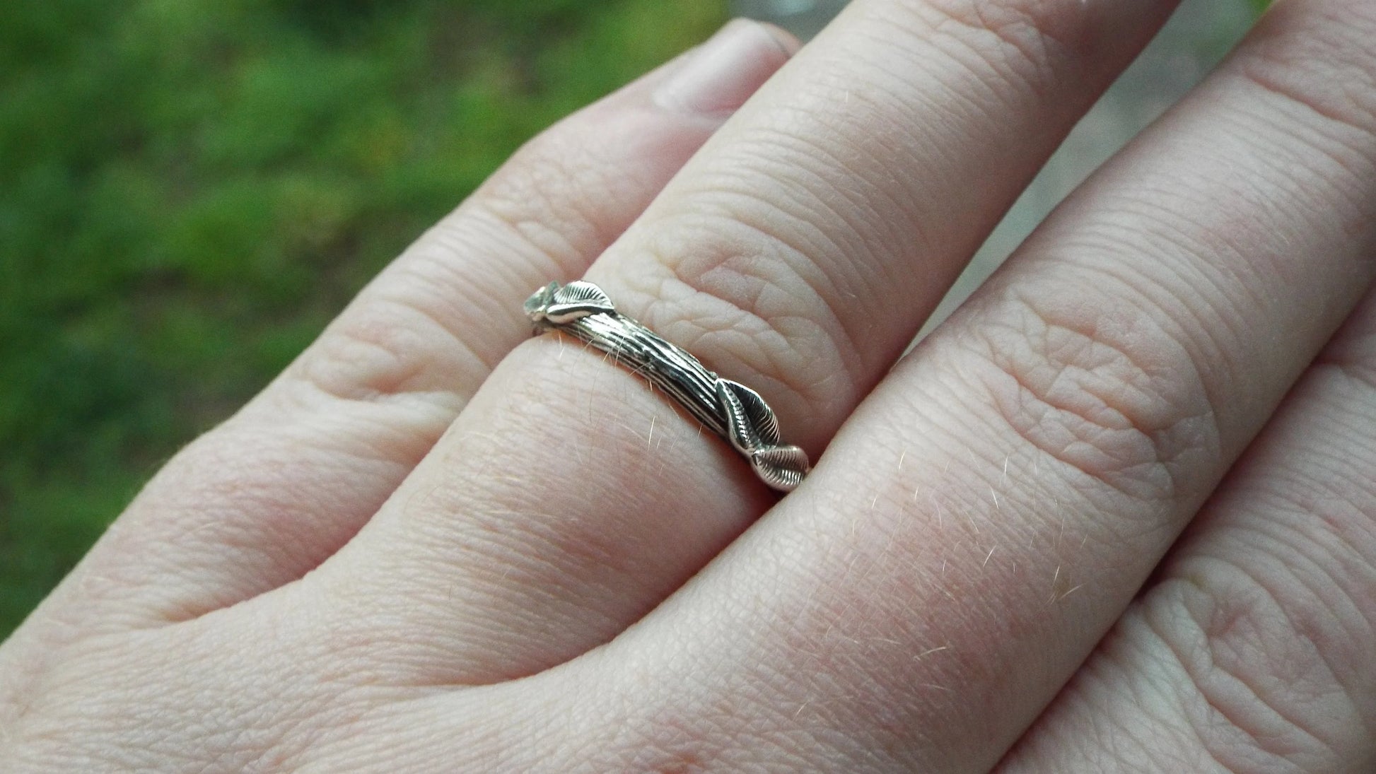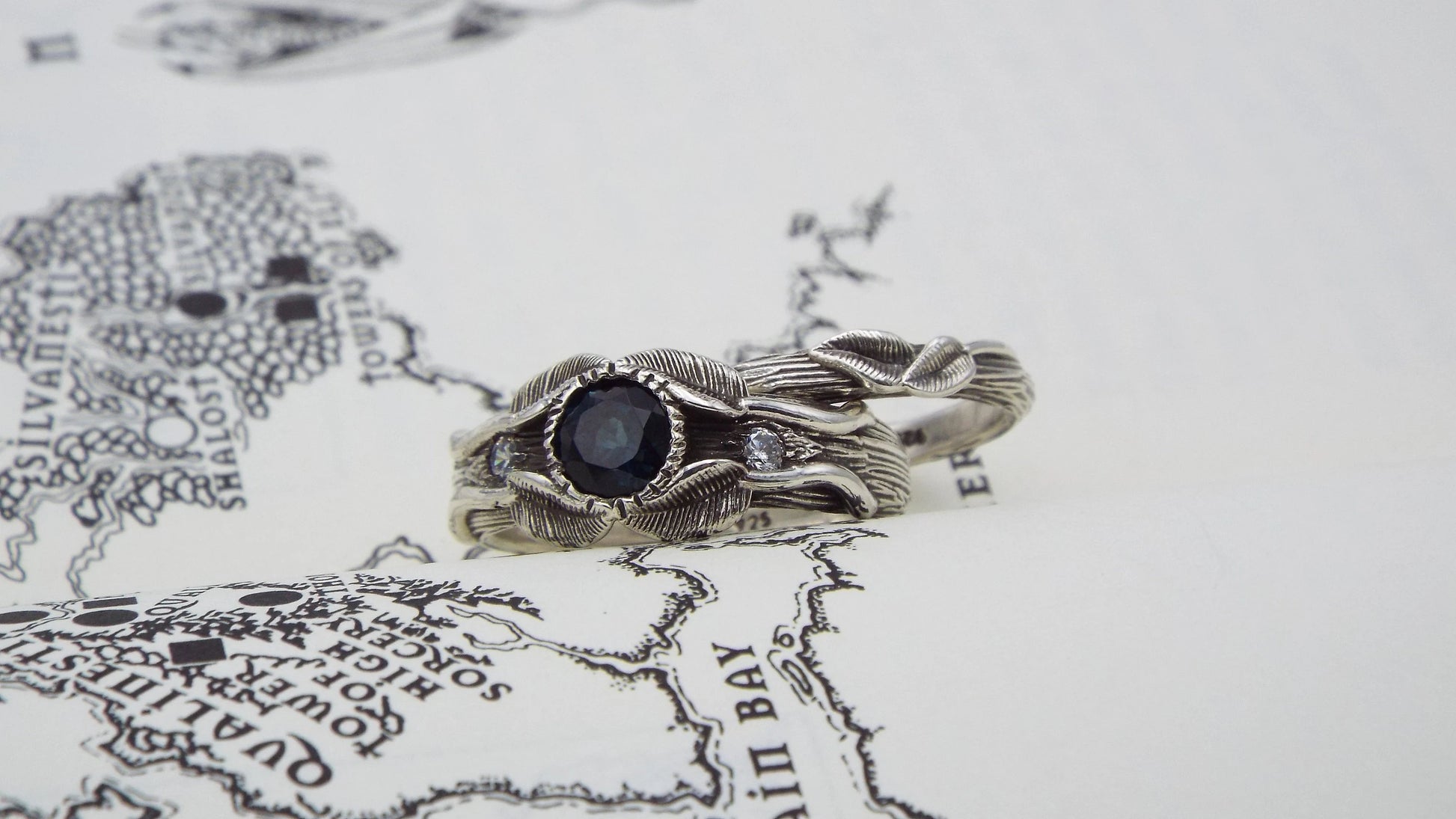 Each piece of jewelry is created using a digital sculpting program to sculpt the vines, leaves, and branch texture of the mounting, then the piece of jewelry is brought to life through the age old method of lost wax casting. After casting each ring is hand finished, including texturing, polishing, stone setting and oxidizing the silver.