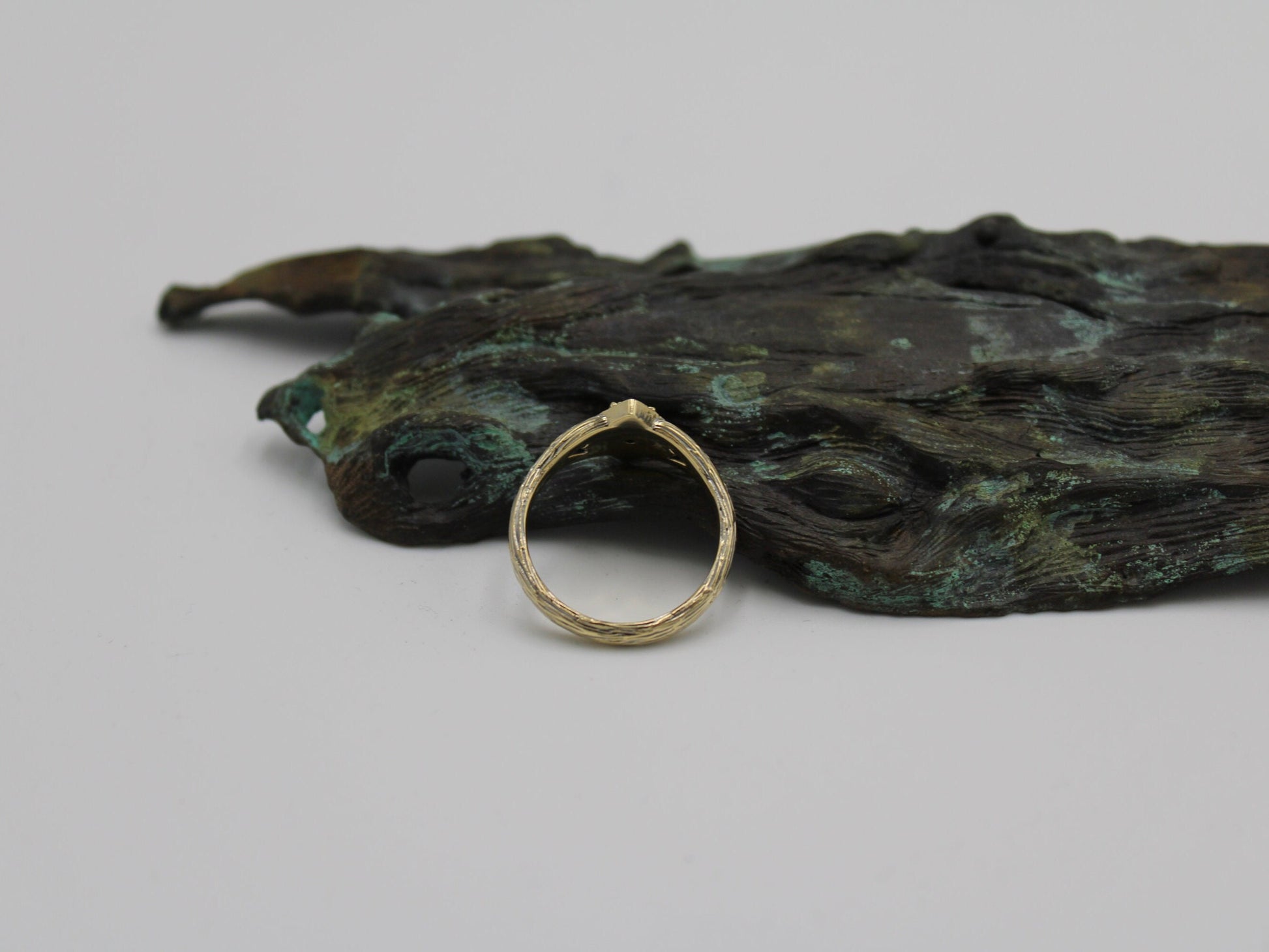 Each piece of jewelry is created using a digital sculpting program to sculpt the lotus, crescent moons, and branch texture of the mounting, then the piece of jewelry is brought to life through the age old method of lost wax casting. After casting each ring is hand finished, including texturing, polishing, and stone setting.