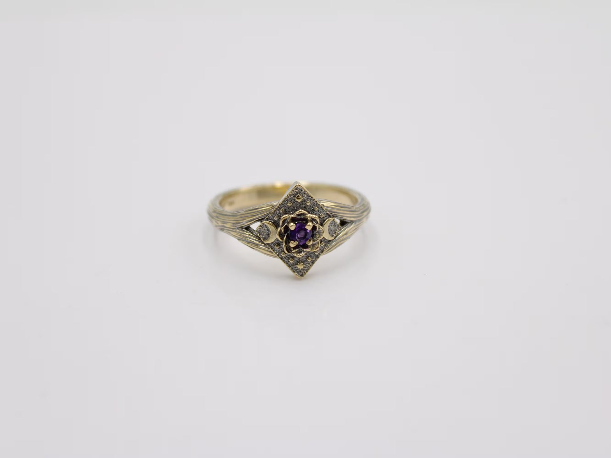 Elevate your love story with this exquisite amethyst lotus and moon engagement ring set in 14k gold. This stunning piece features a vibrant amethyst stone set in a delicate lotus flower design, symbolizing purity and devotion. The crescent moon detail adds a touch of enchanting elegance, making it the perfect choice for a unique and meaningful proposal. Handcrafted with care and attention to detail, this ring is sure to be cherished for a lifetime. Make a statement of everlasting love with this one-of-a-kind piece.