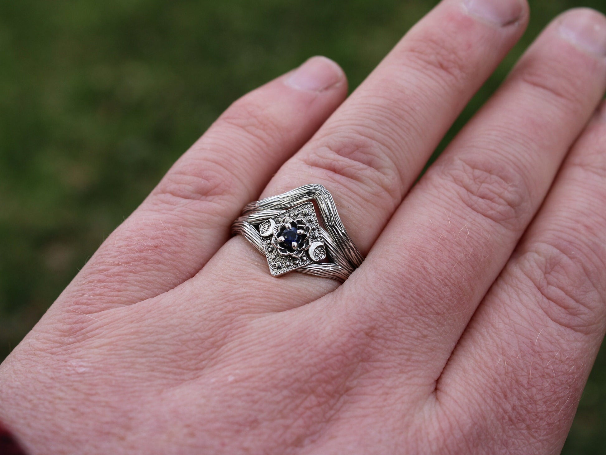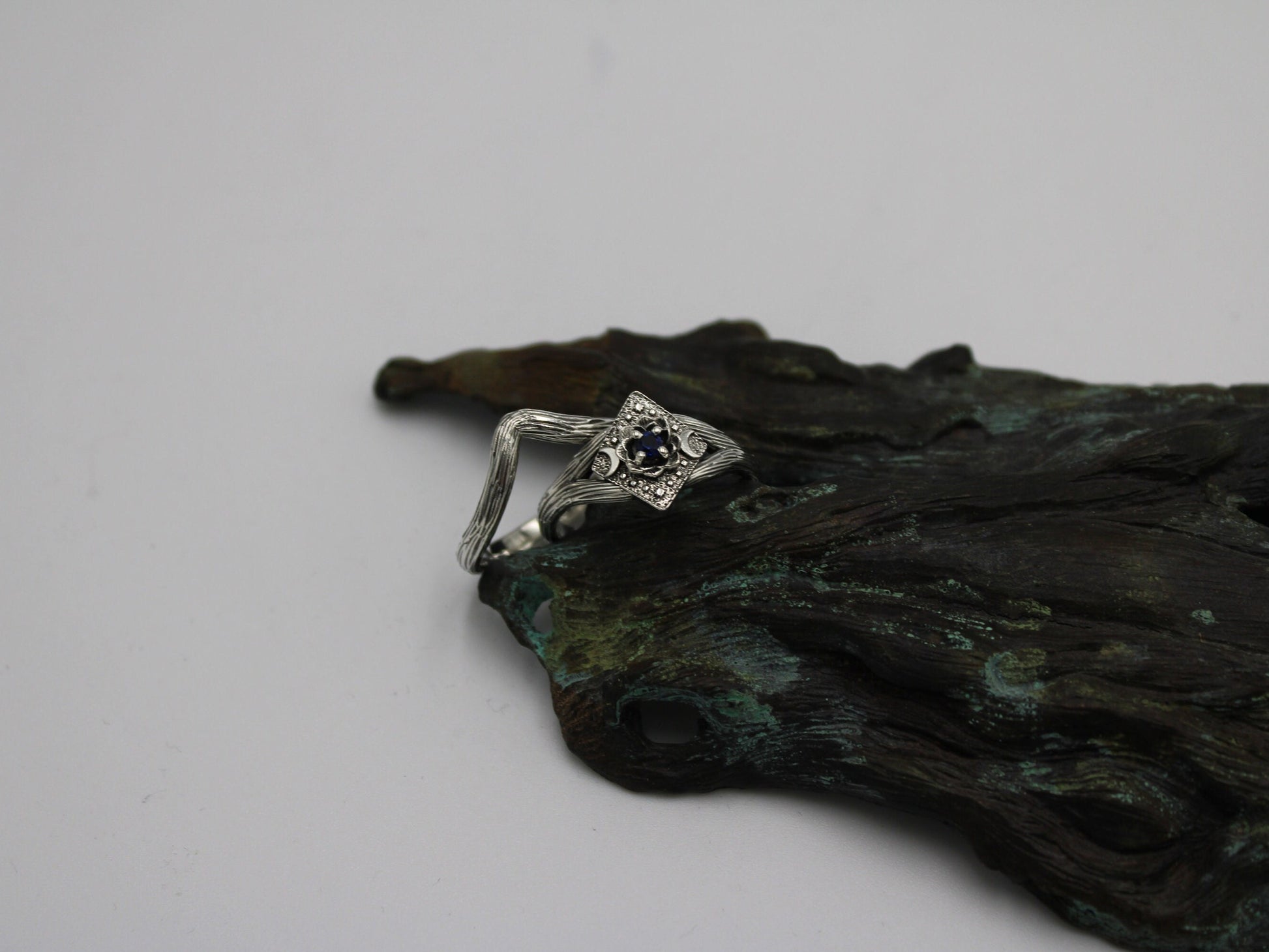 Each piece of jewelry is created using a digital sculpting program to sculpt the lotus, crescent moons, and branch texture of the mounting, then the piece of jewelry is brought to life through the age old method of lost wax casting. After casting each ring is hand finished, including texturing, polishing, and stone setting.