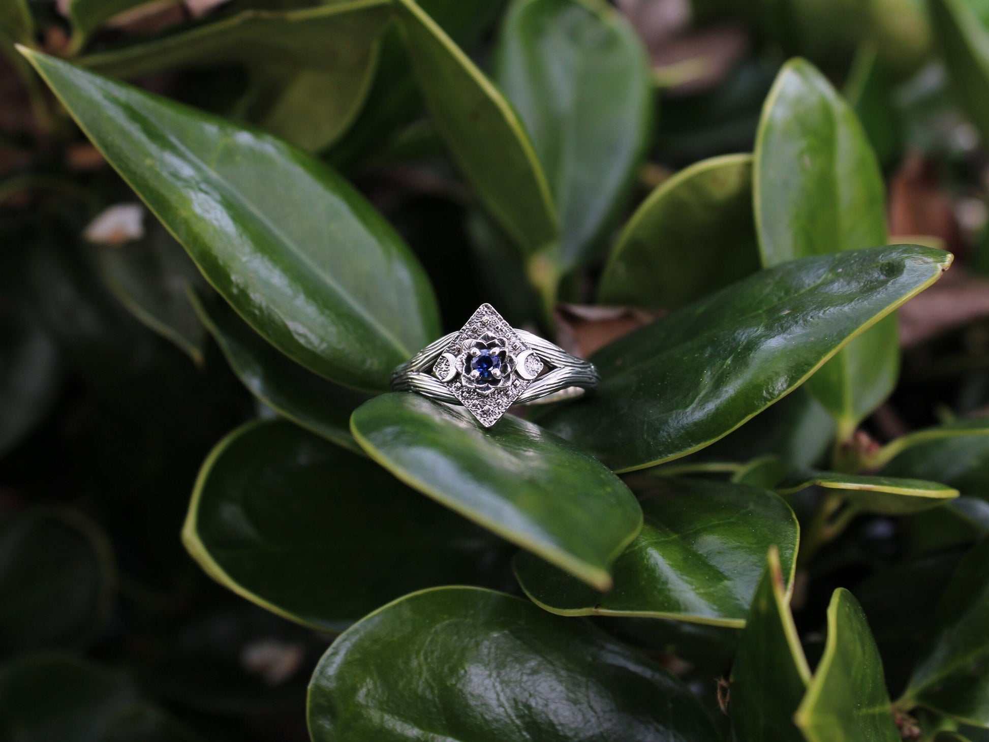 Elevate your love story with this exquisite sapphire lotus and moon engagement ring set in sterling silver. This stunning piece features a vibrant sapphire stone set in a delicate lotus flower design, symbolizing purity and devotion. The crescent moon detail adds a touch of enchanting elegance, making it the perfect choice for a unique and meaningful proposal. Handcrafted with care and attention to detail, this ring is sure to be cherished for a lifetime. Make a statement of everlasting love with this one-of-a-kind piece.