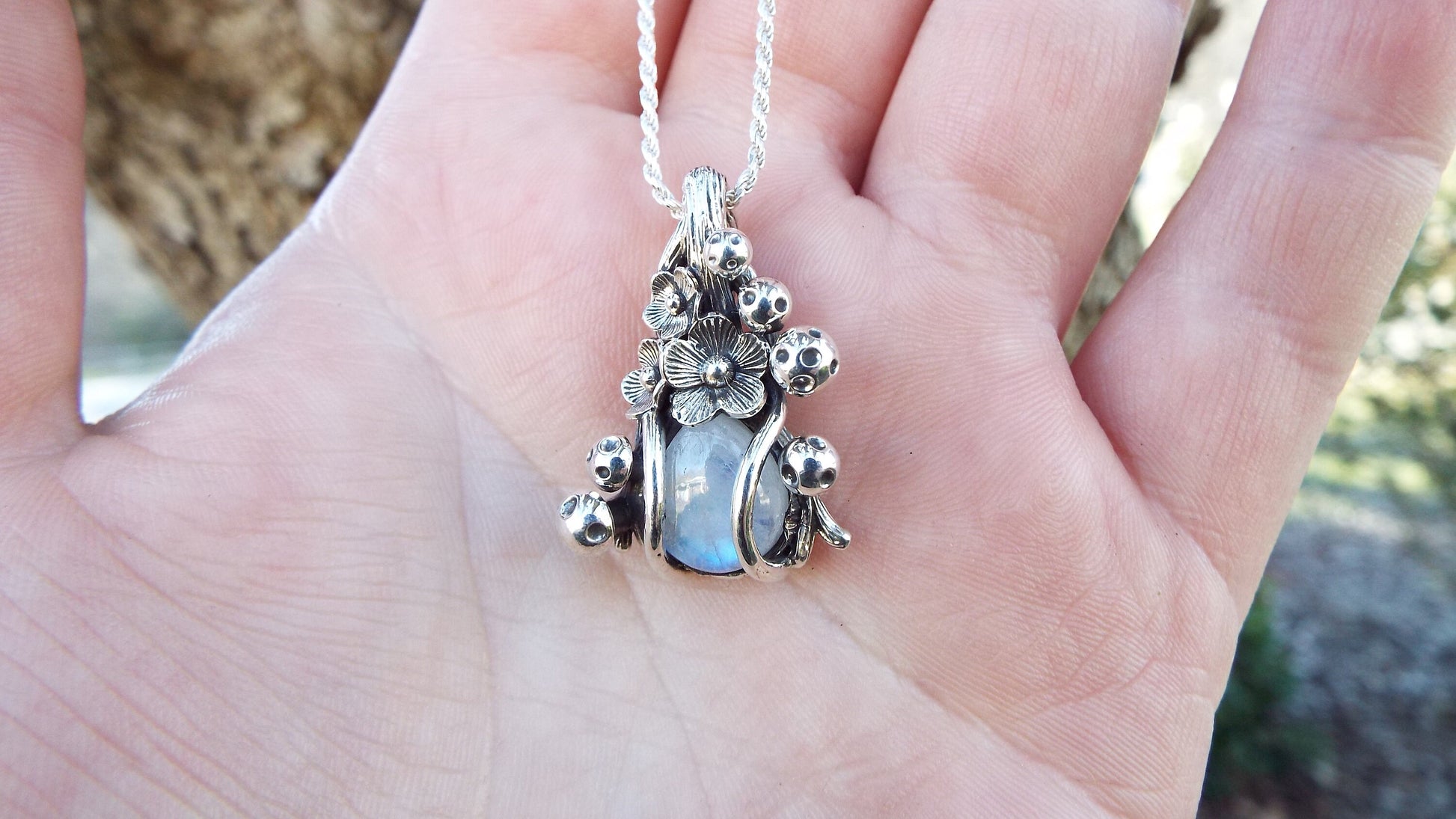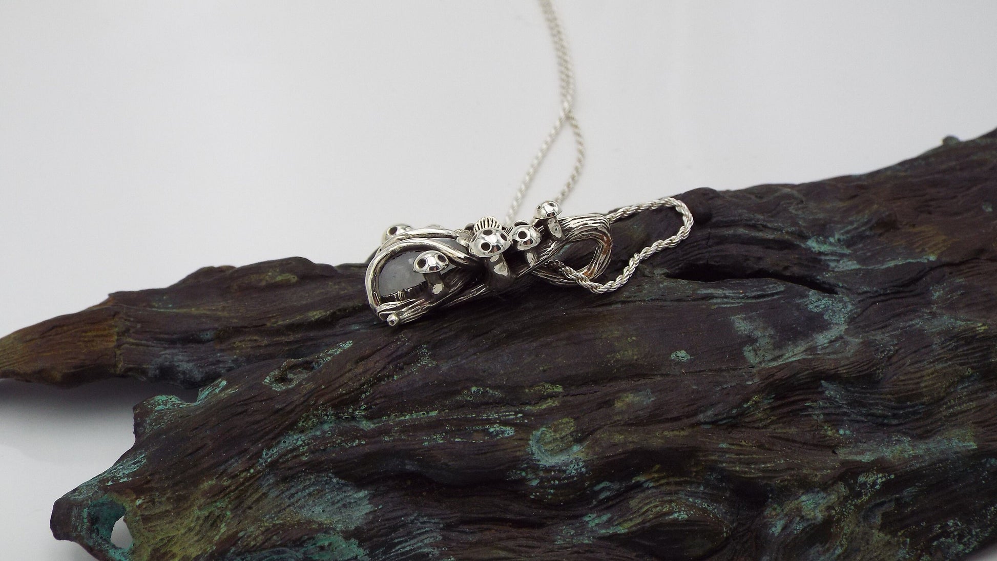 Each piece of jewelry is created using a digital sculpting program to sculpt the vines, flowers, mushrooms, and branch texture of the mounting, then the piece of jewelry is brought to life through the age old method of lost wax casting. After casting each pendant is hand finished, including texturing, polishing, stone setting and oxidizing the silver.
