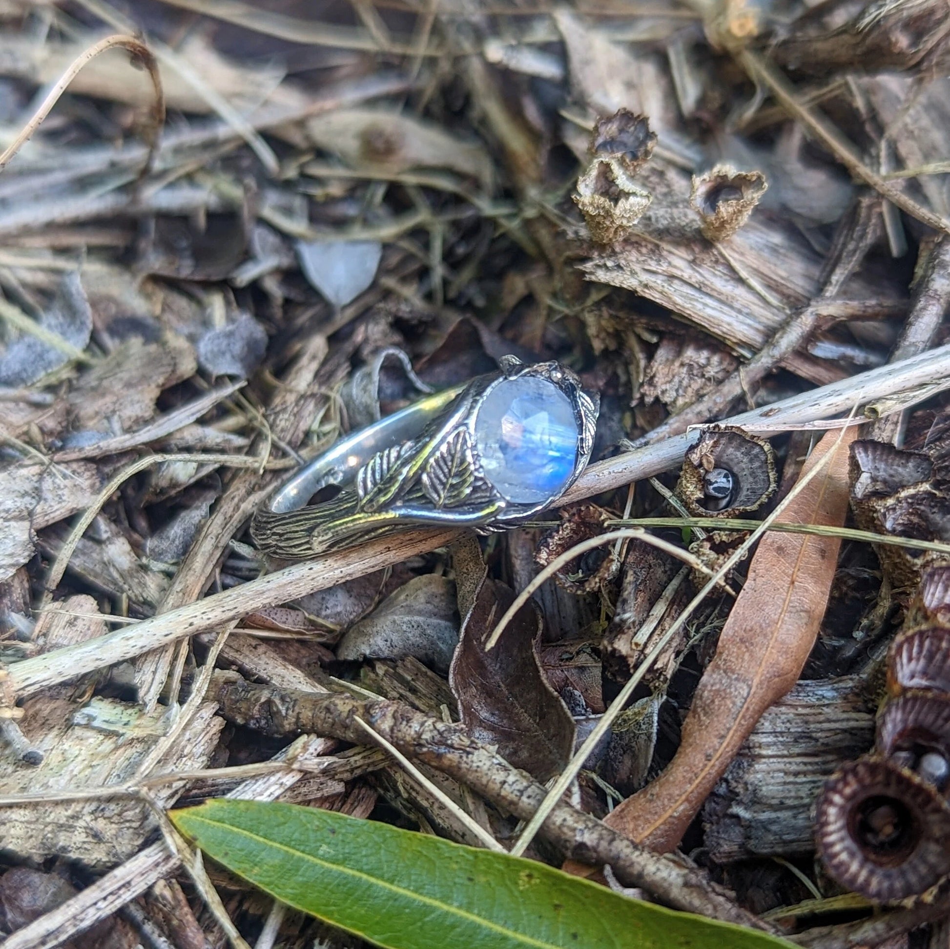 "Moonstone Leaf" Sterling Silver Ring. This ring was inspired by the way vines invade a forest and grow from every branch becoming a beautiful collage of foliage and embracing the trees and landscape around them. The vines on the ring flow around around the ring and over the Moonstone to create a beautiful scene or the tranquil embrace of the leaves. The ring features a 8mm Moonstone in a Solid Sterling Silver mounting and will make the perfect artistic accent to show off your personal style.