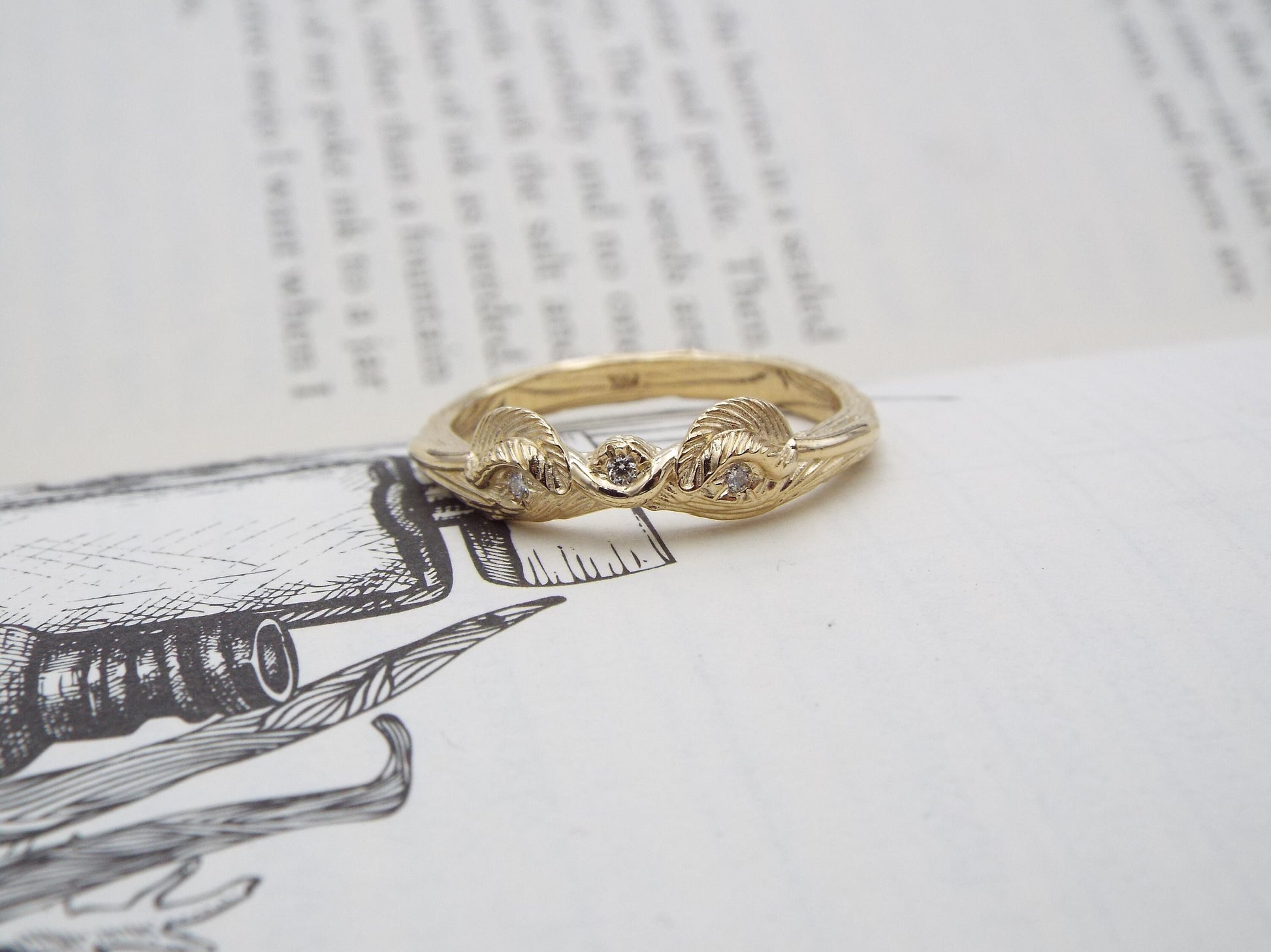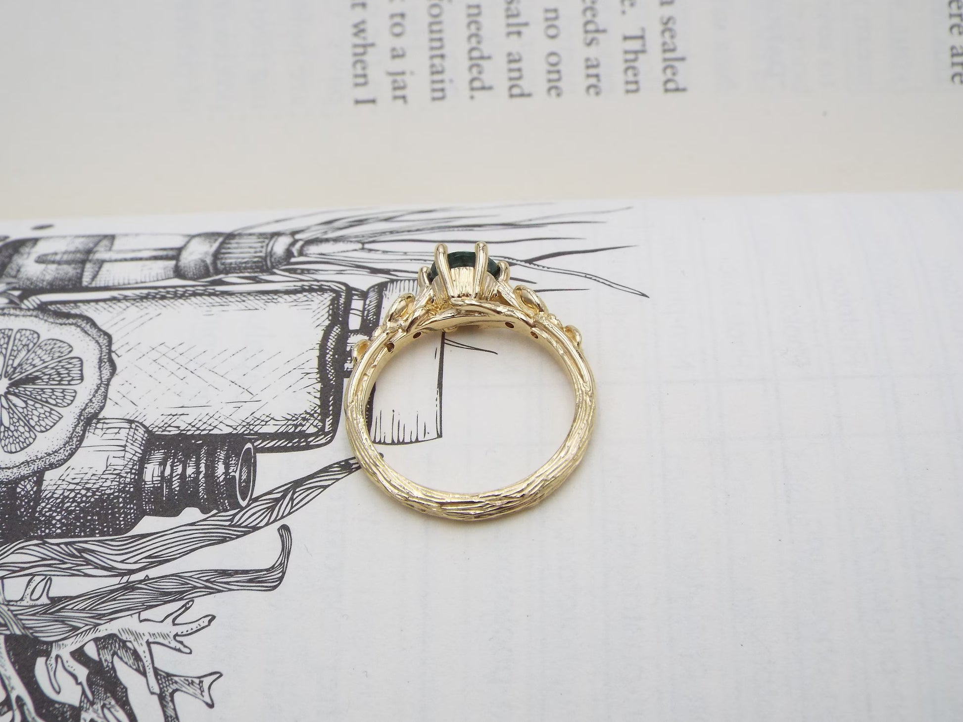Each piece of jewelry is created using a digital sculpting program to sculpt the vines, leaves, and branch texture of the mounting, then the piece of jewelry is brought to life through the age old method of lost wax casting. After casting each ring is hand finished, including texturing, polishing, and stone setting.