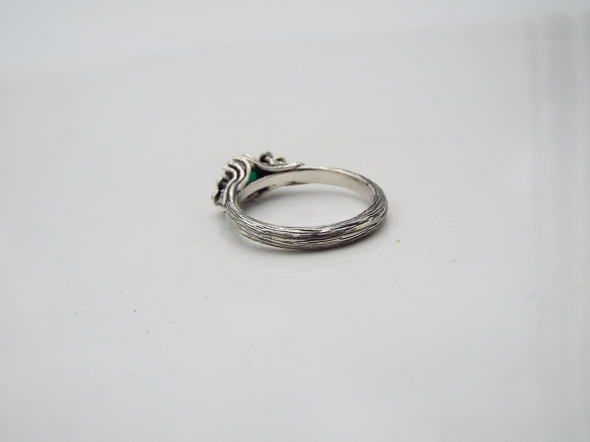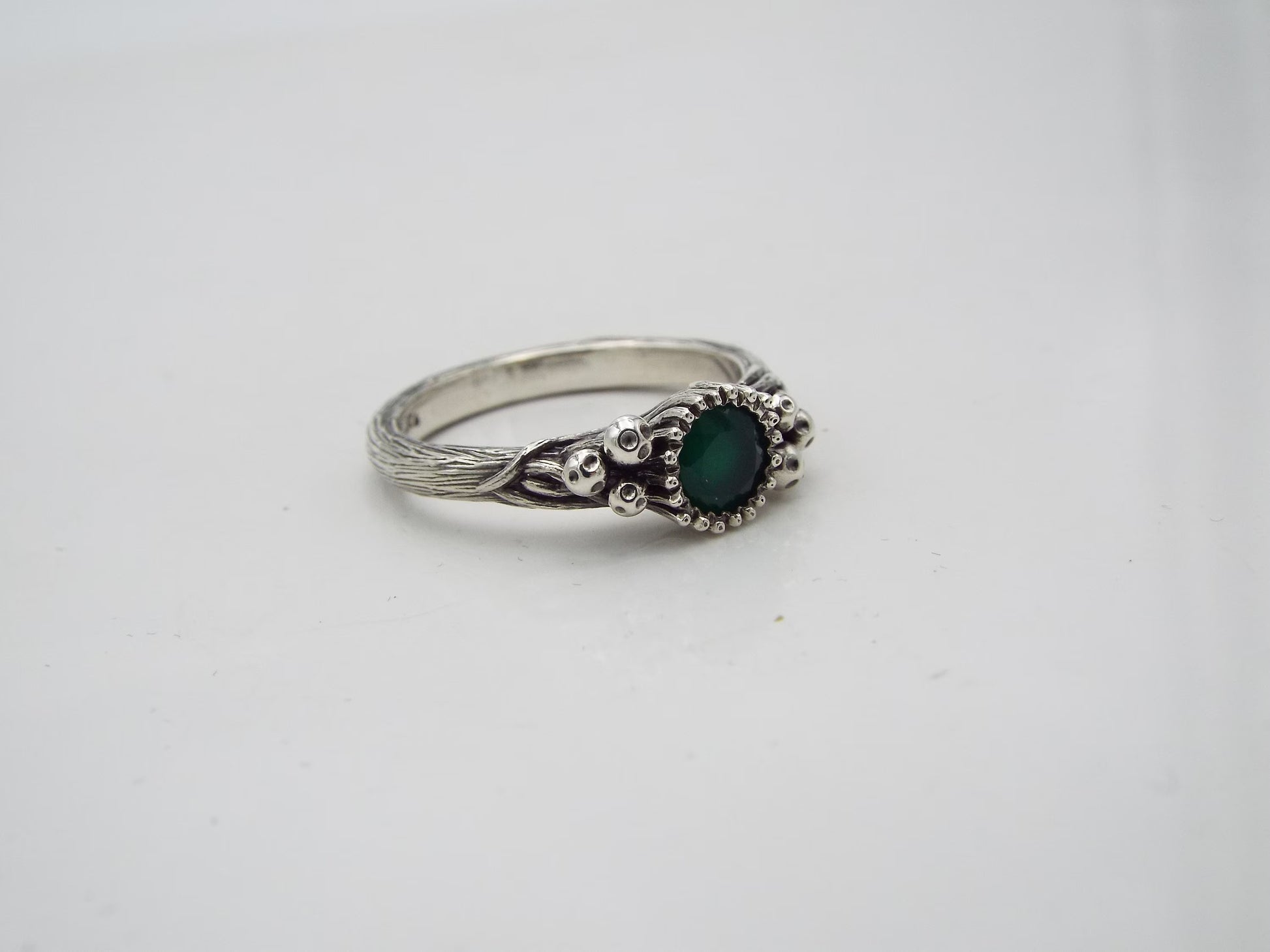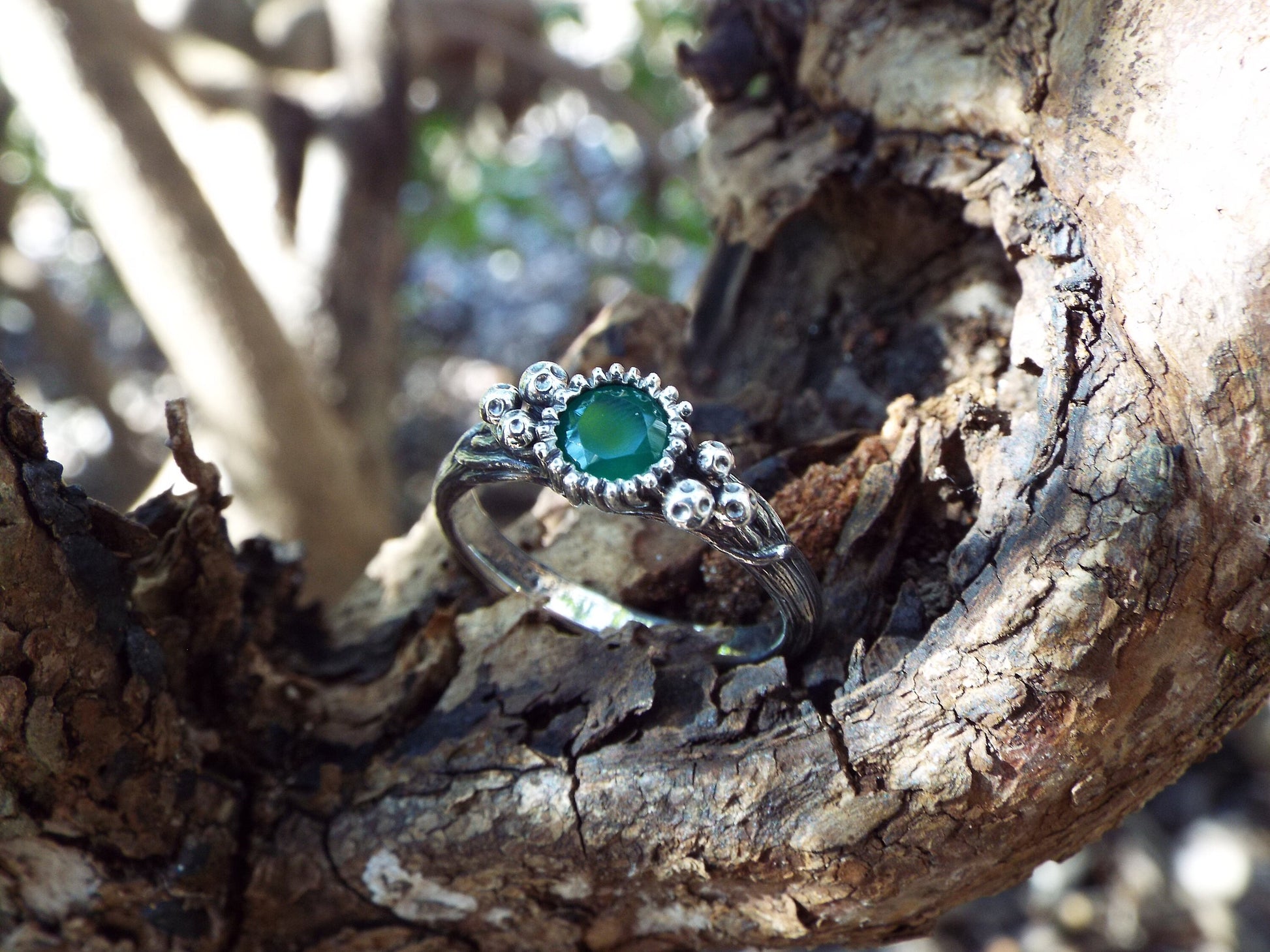Add a touch of nature-inspired charm to your jewelry collection with this stunning green onyx mushroom ring in sterling silver. The vivid green onyx stone is beautifully set in a high-quality sterling silver mushroom design, creating a whimsical and unique piece that is sure to stand out. This eye-catching ring is perfect for nature lovers or anyone wanting to add a pop of color to their ensemble. Handcrafted with attention to detail, this green onyx mushroom ring is a beautiful and versatile accessory that will surely garner compliments wherever you go.