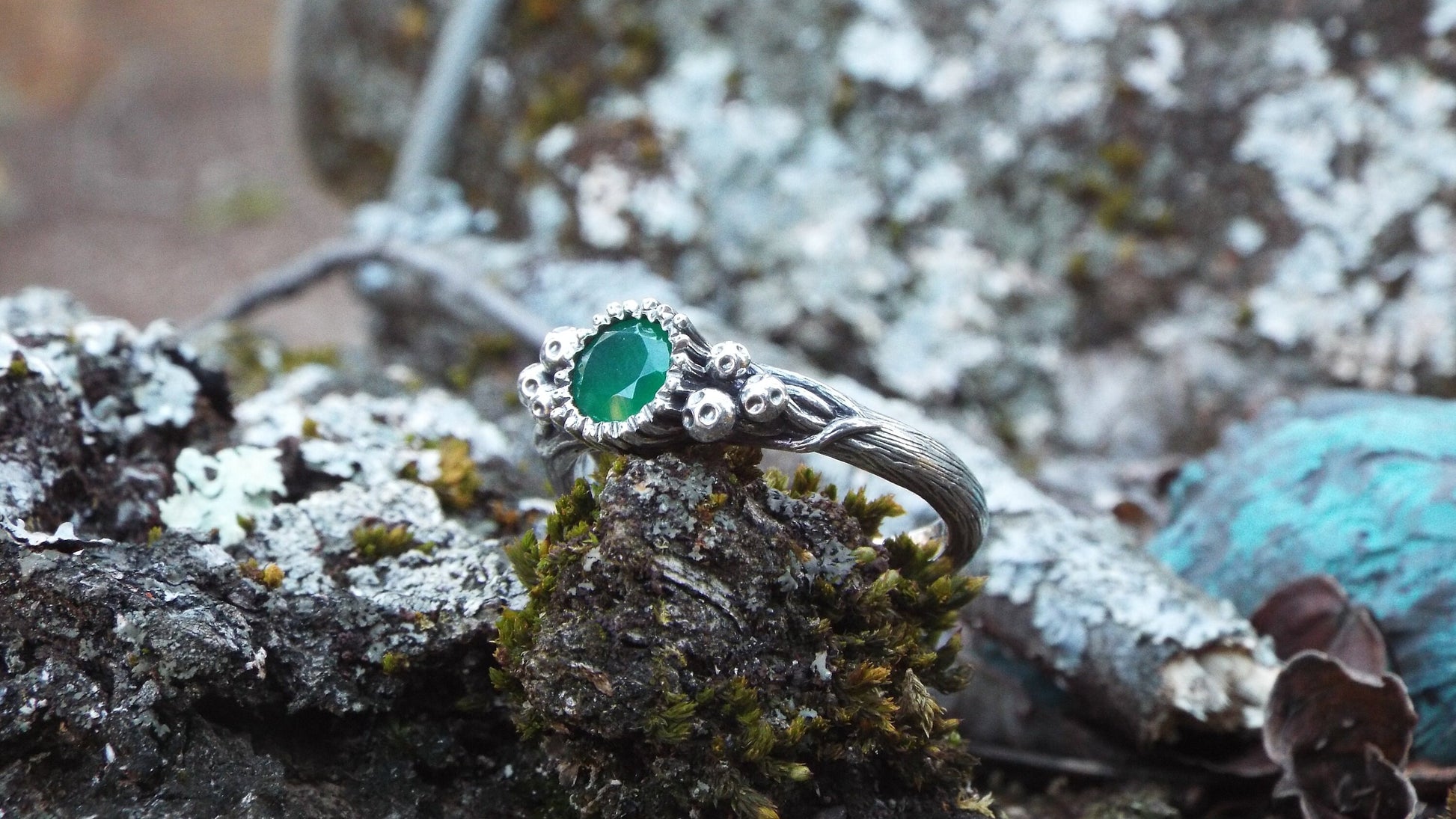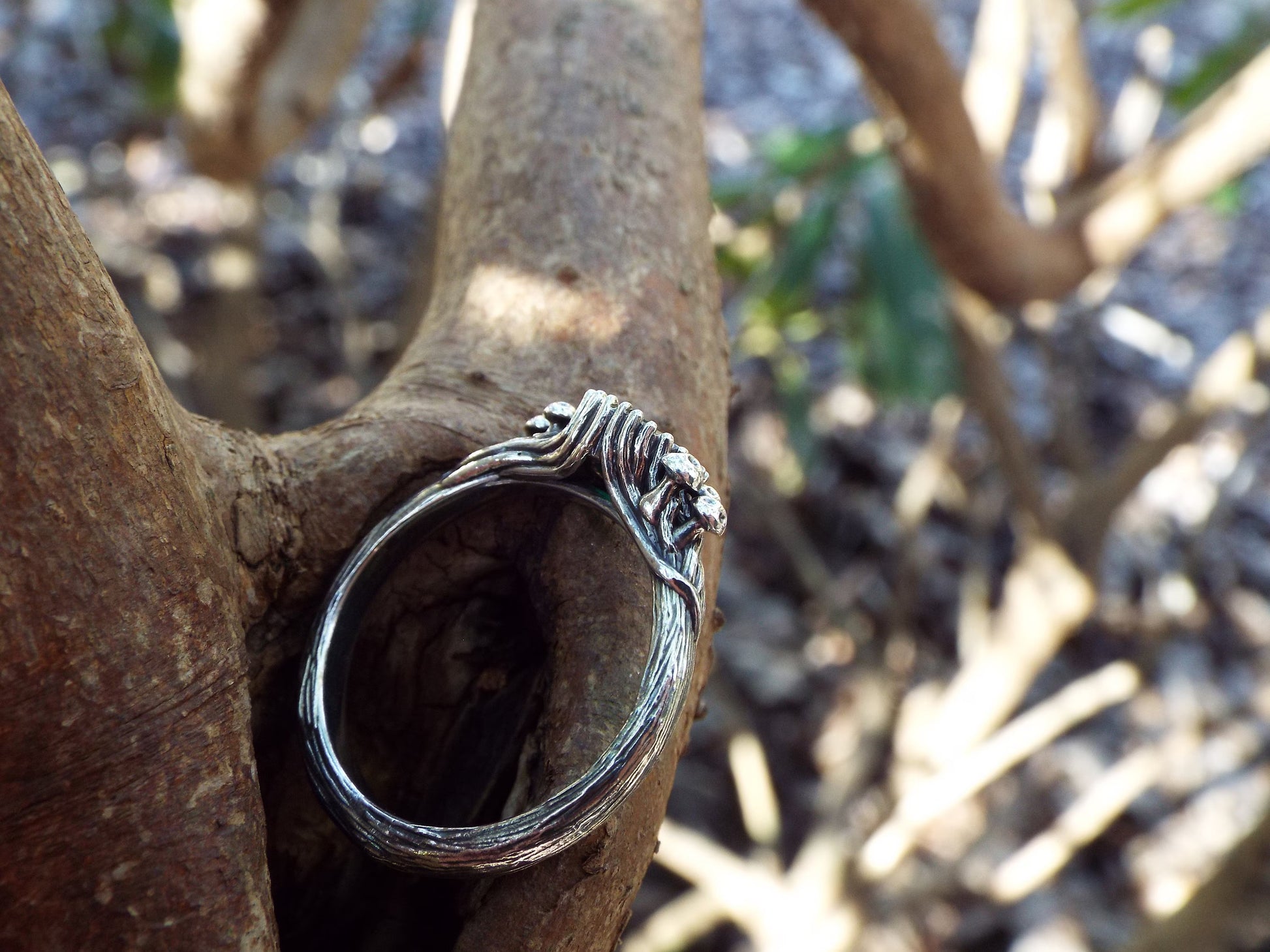 Each piece of jewelry is created using a digital sculpting program to sculpt the vines and branch texture of the mounting, then the piece of jewelry is brought to life through the age old method of lost wax casting. After casting each ring is hand finished, including texturing, polishing, and stone setting.