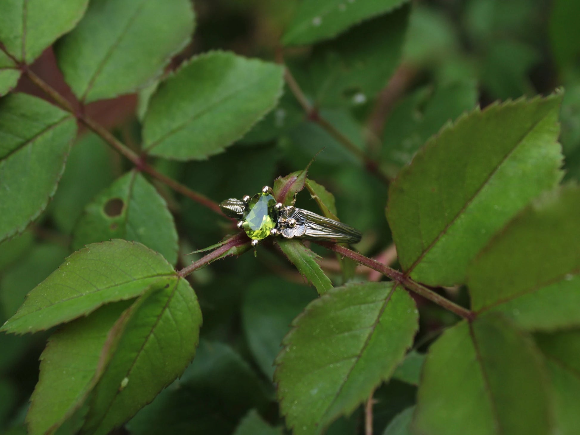 Each piece of jewelry is created using a digital sculpting program to sculpt the snail, flower, and branch texture of the mounting, then the piece of jewelry is brought to life through the age old method of lost wax casting. After casting each ring is hand finished, including texturing, polishing, and stone setting.