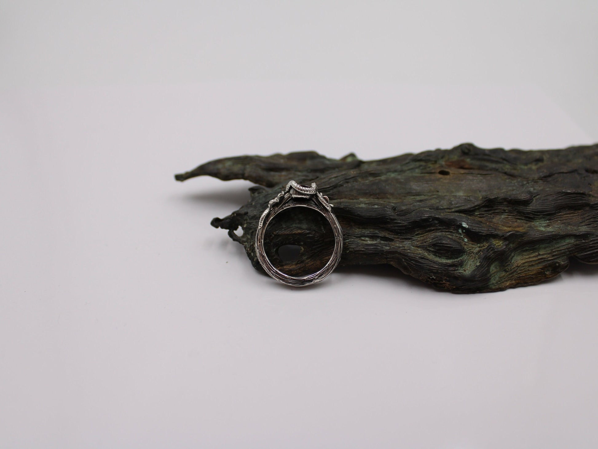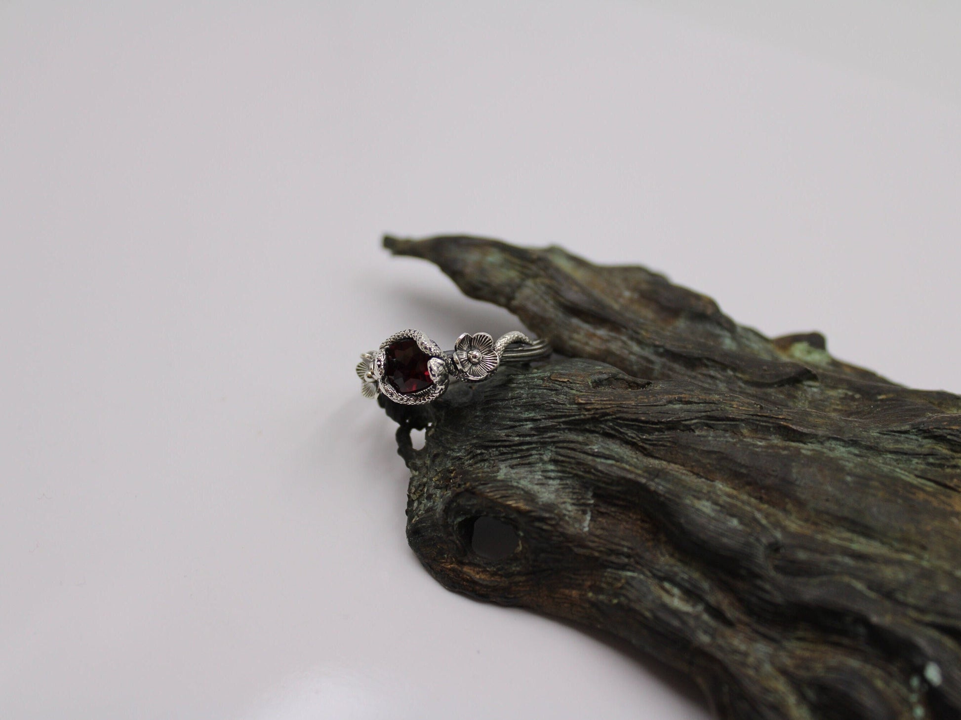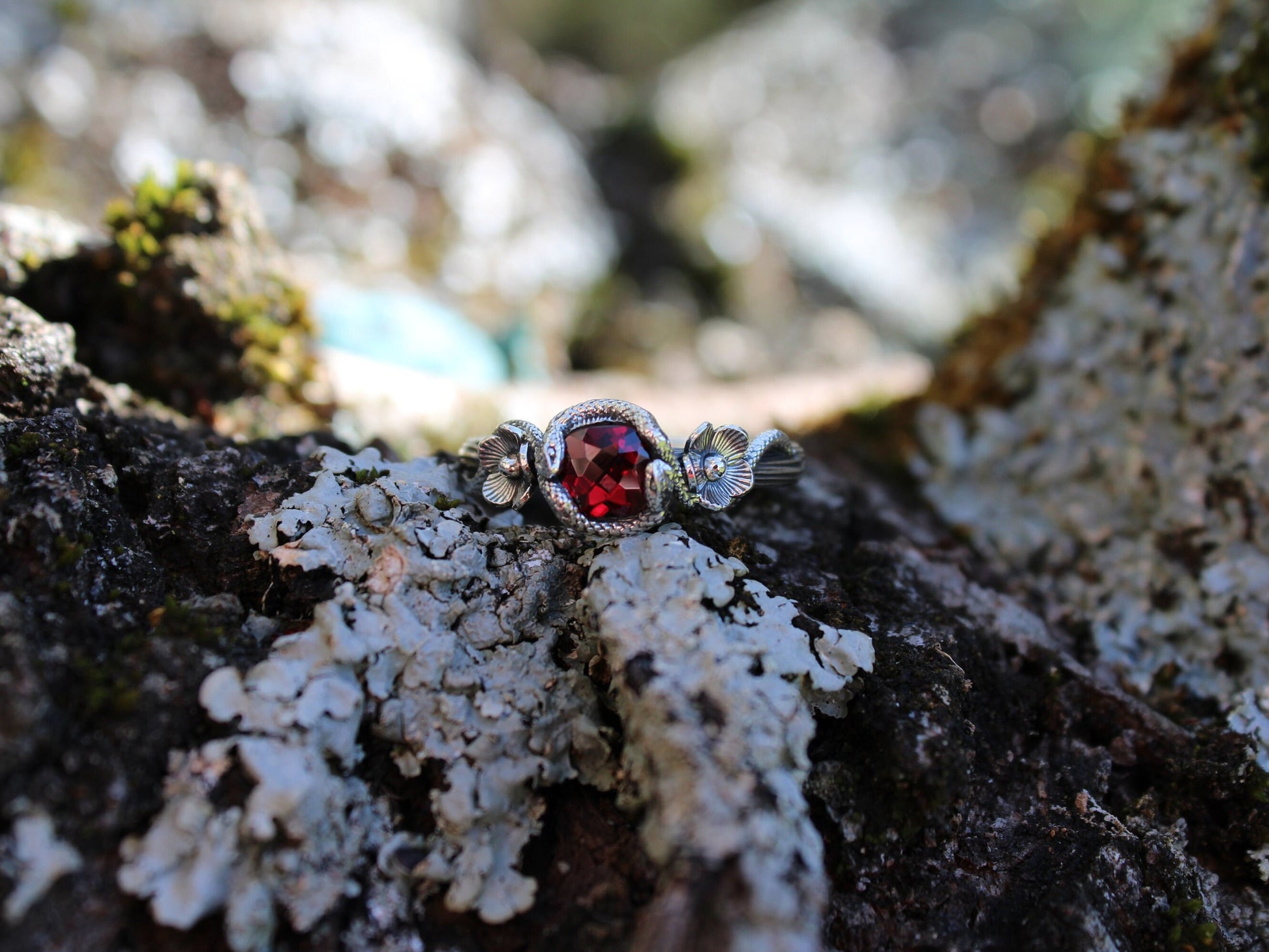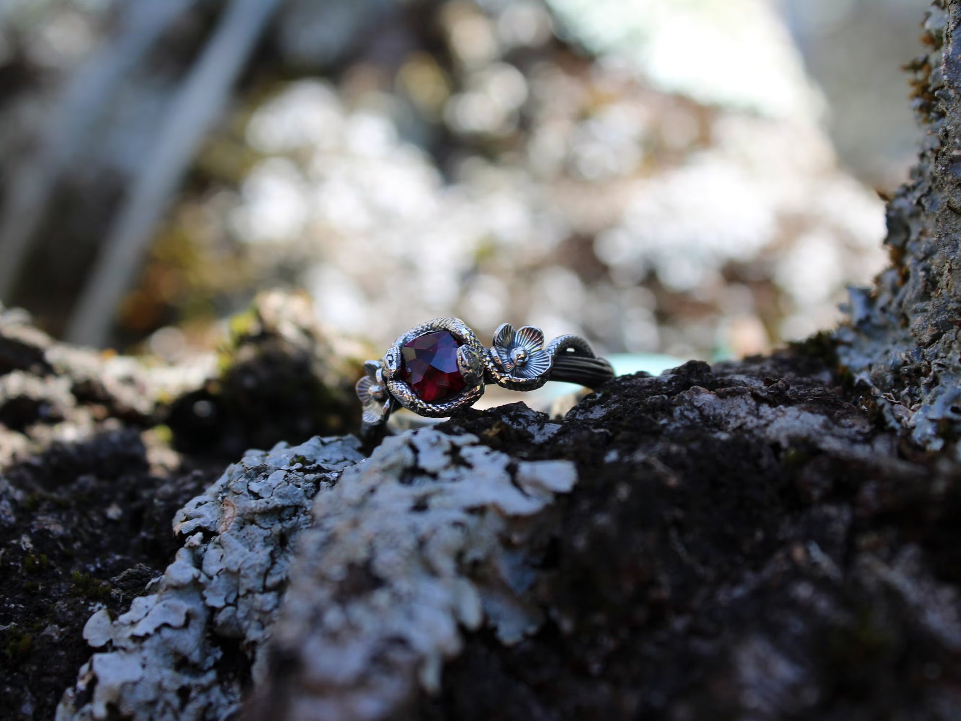 Introducing our stunning "Serpent's Embrace" snake and flower cushion cut garnet engagement ring, crafted with sterling silver to symbolize eternal love and commitment. The deep red hue of the garnet stone captures the essence of passion and romance, while the intricate snake and flower design adds a touch of unique elegance. This ring is the perfect choice for those seeking a one-of-a-kind piece that beautifully combines nature-inspired elements with timeless beauty. Make a bold statement of love with this exquisite ring that will surely be treasured for a lifetime.