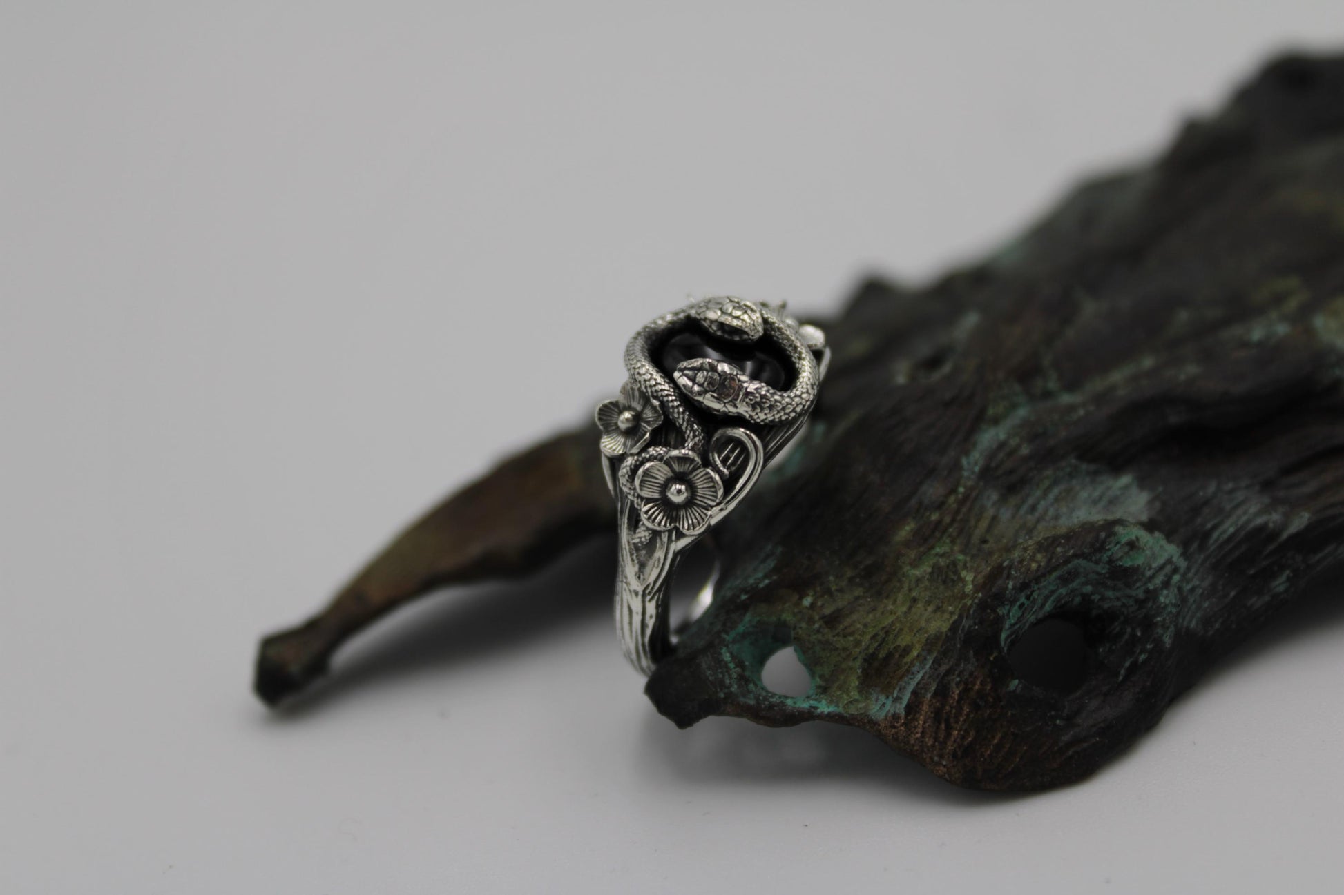Each piece of jewelry is created using a digital sculpting program to sculpt the snakes, flowers, and branch texture of the mounting, then the piece of jewelry is brought to life through the age old method of lost wax casting. After casting each ring is hand finished, including texturing, polishing, stone setting and oxidizing the silver.