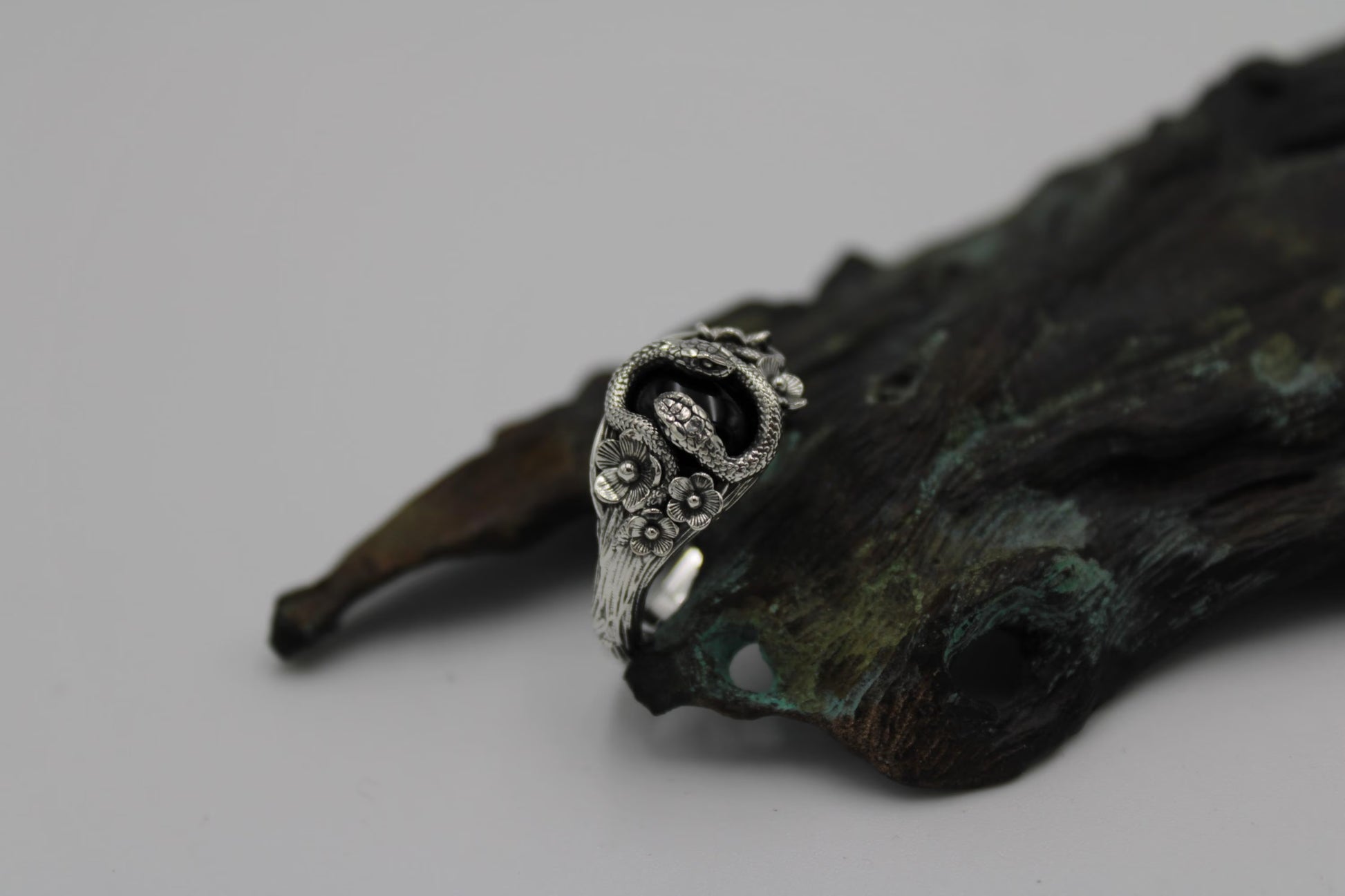 Mysterious, bold, and rooted in shadow—the Snake & Bloom Ring with black onyx captures the strength and quiet power of the dark forest. A silver serpent weaves through detailed flowers, coiled protectively around a deep, polished black onyx cabochon.